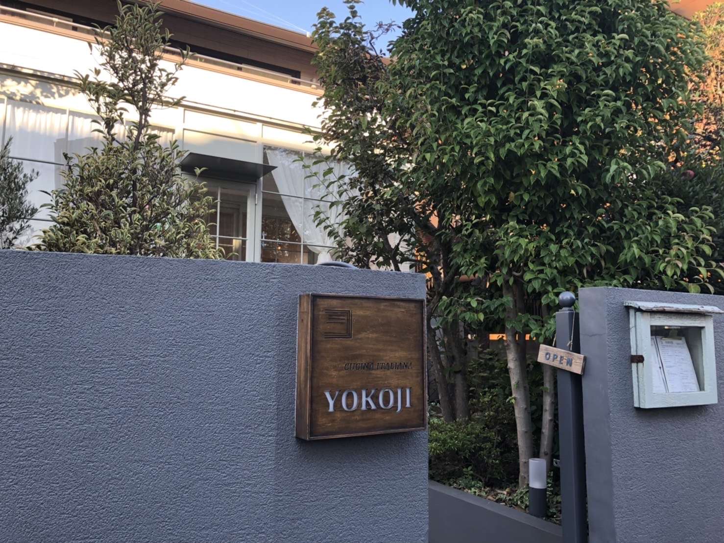 グレーの塀で、木の表札に「YOKOJI」の店名。
