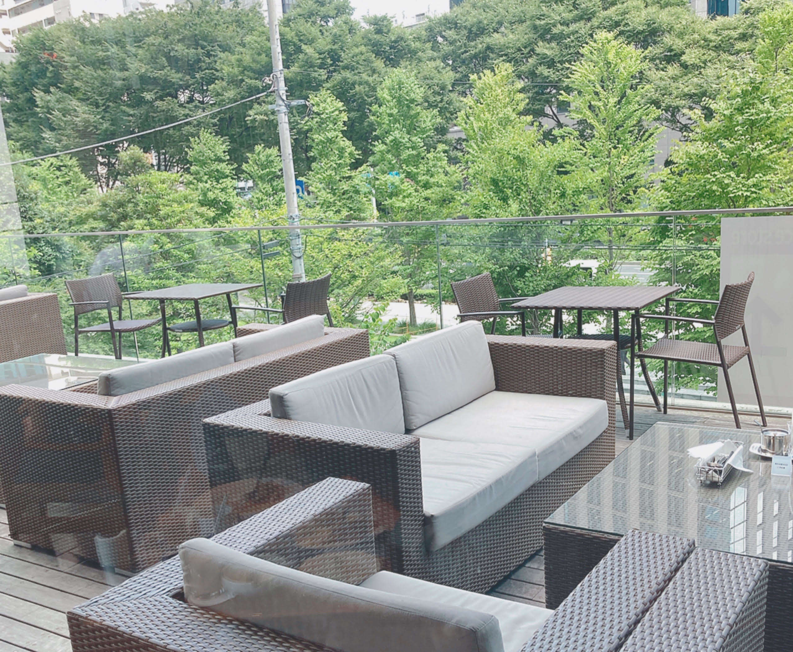 西新宿の街路樹に囲まれた「カフェテラスロイ」