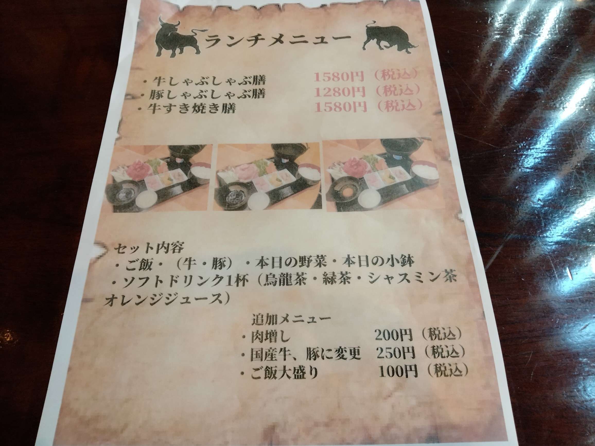ランチは「牛しゃぶしゃぶ膳」「豚しゃぶしゃぶ膳」「牛すき焼き膳」の3種類。