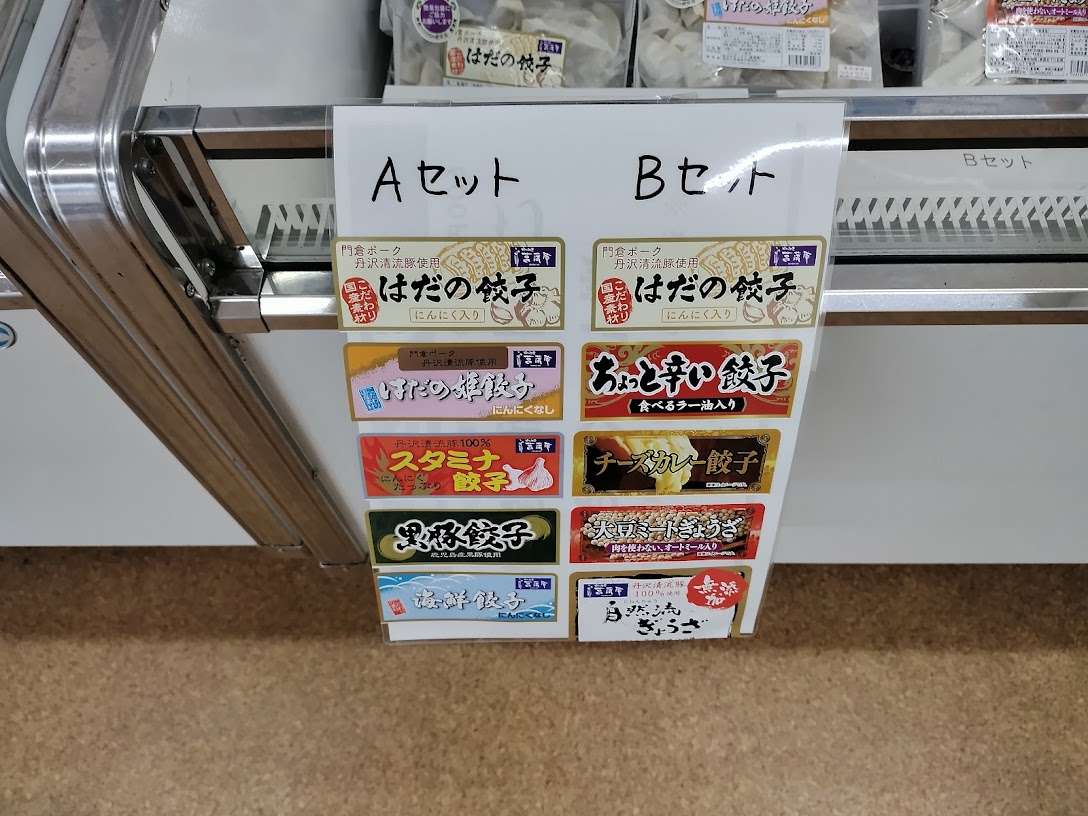 伺った日には、Aセット、Bセットと、数種類の餃子が入ったセットが販売されていました。