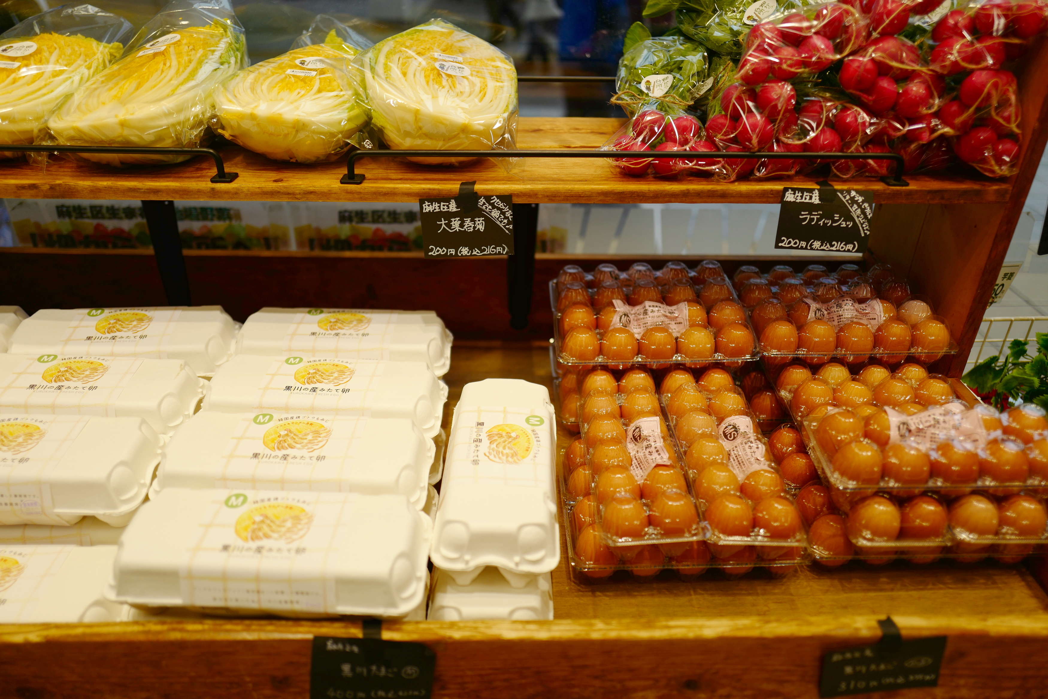 その時々に収穫された、生産者の顔が見える、おいしい新鮮な野菜や卵を買うことができます。