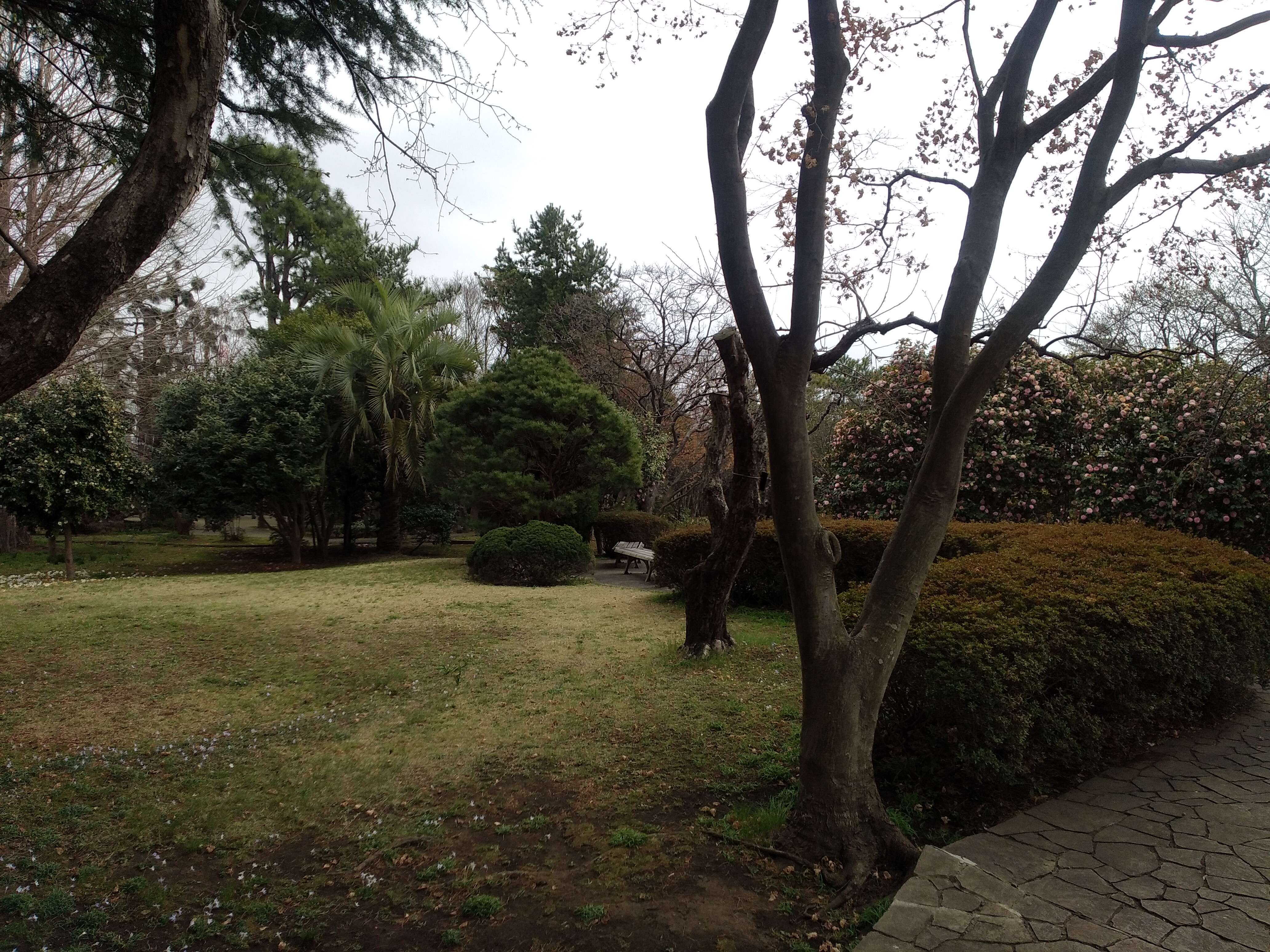 苑内にはあちこちにいろいろな色のツバキが咲いていました。