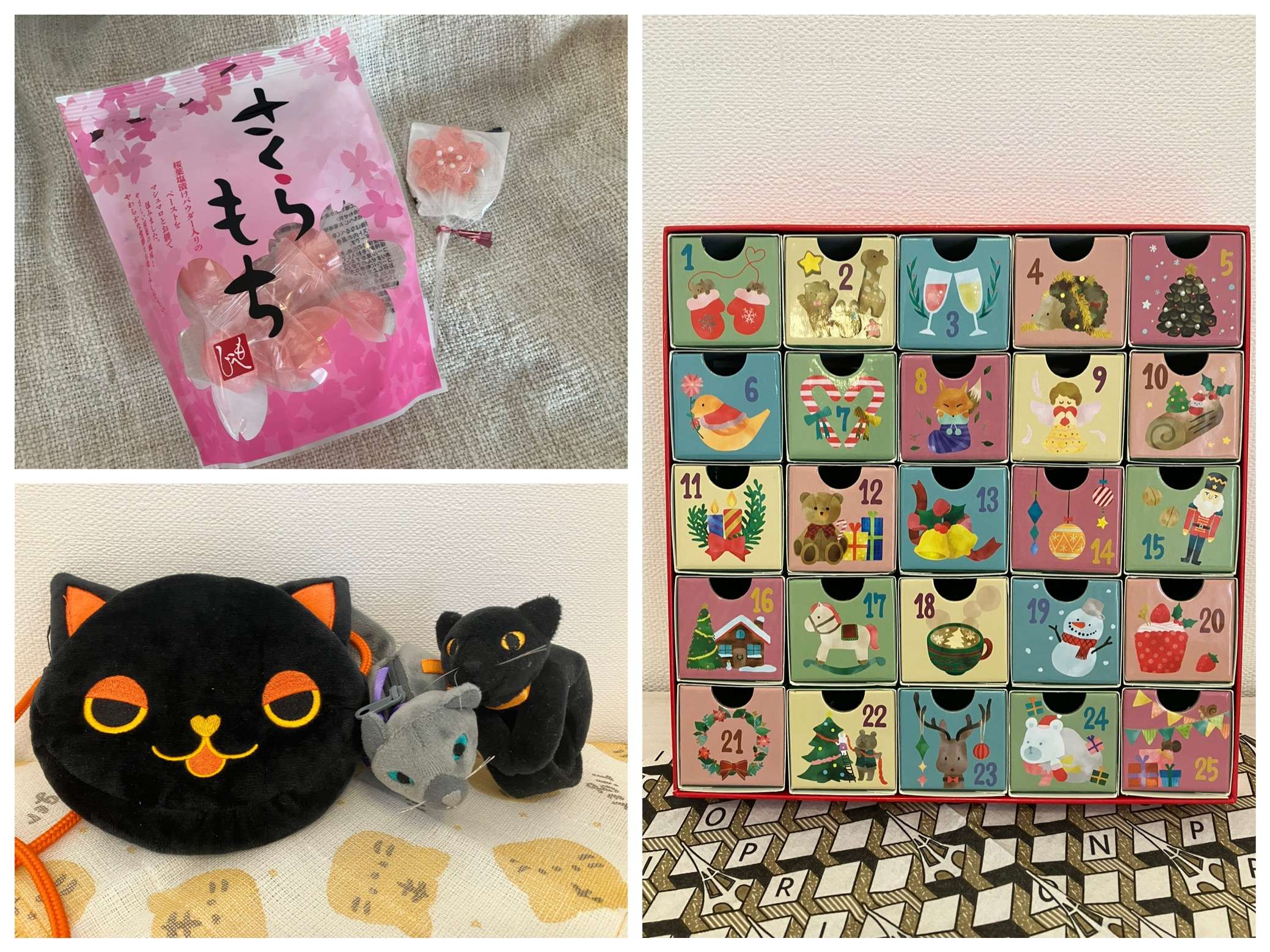 これまでも、春の始まりには桜関連のお菓子、ハロウィンには黒猫のポシェットやリストバンド(お菓子入り)、クリスマスにはアドベントカレンダーなどを購入しました。