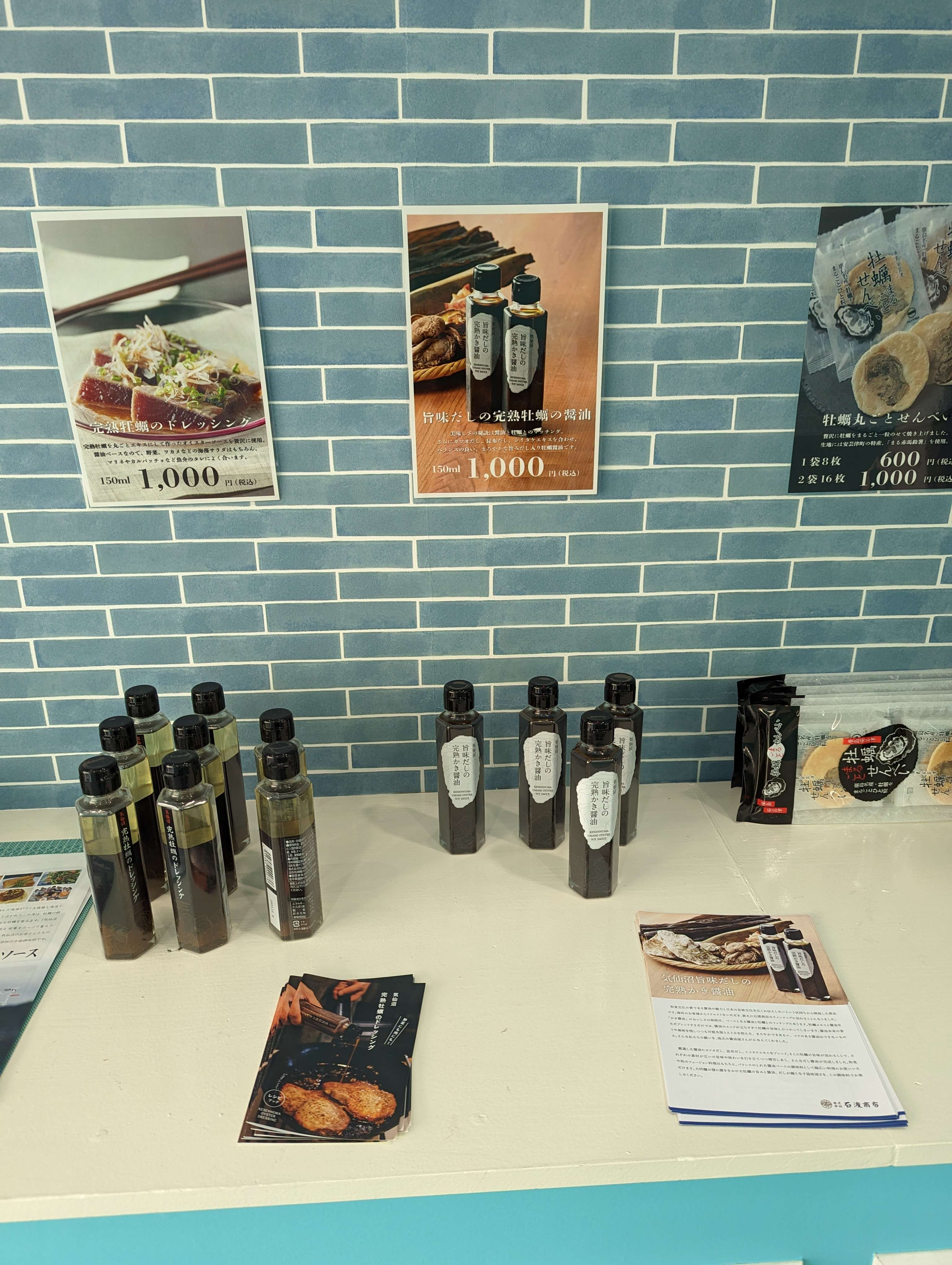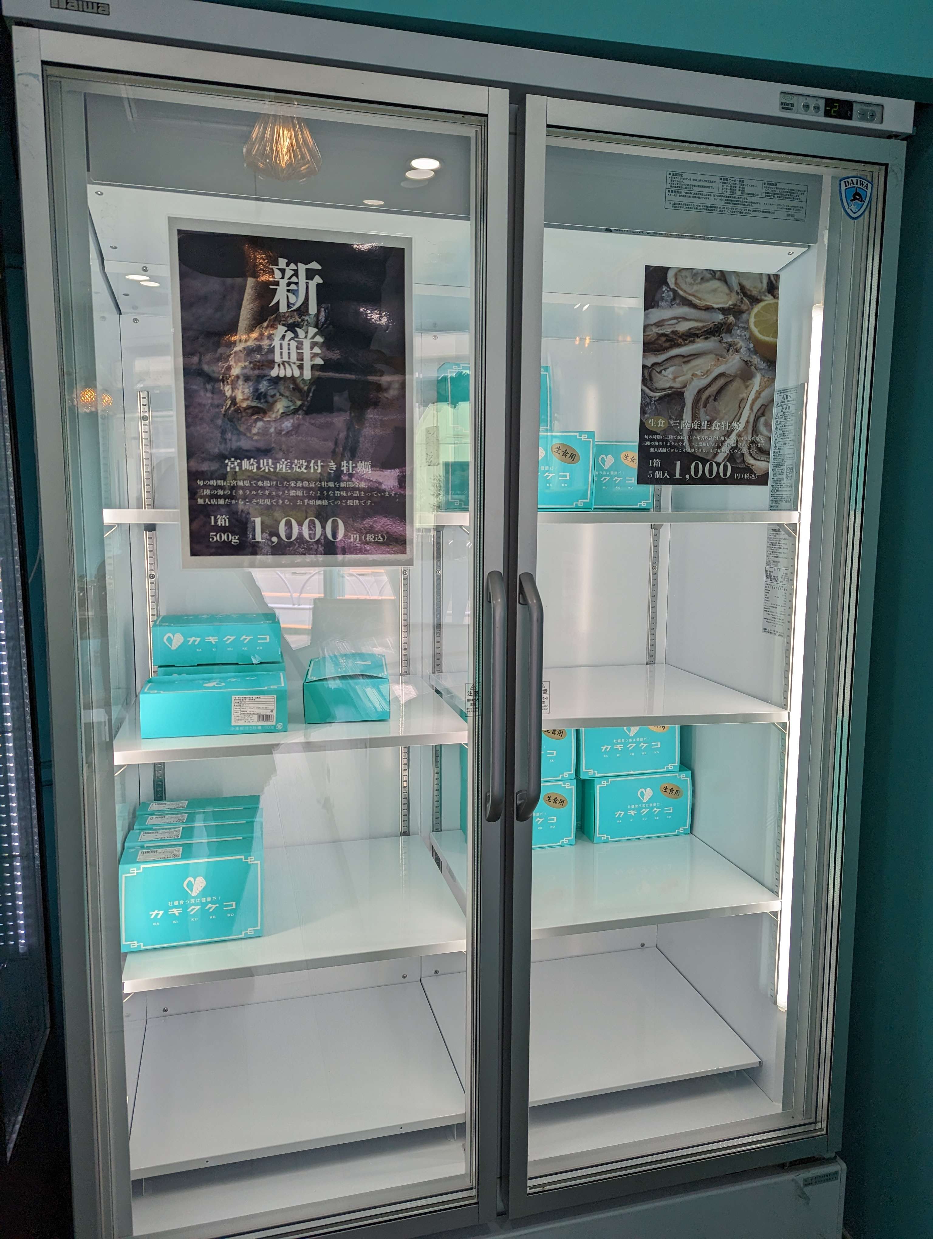 入り口ちかくには牡蠣しょうゆやオイルの瓶があり、店内を進むと牡蠣の冷凍庫。