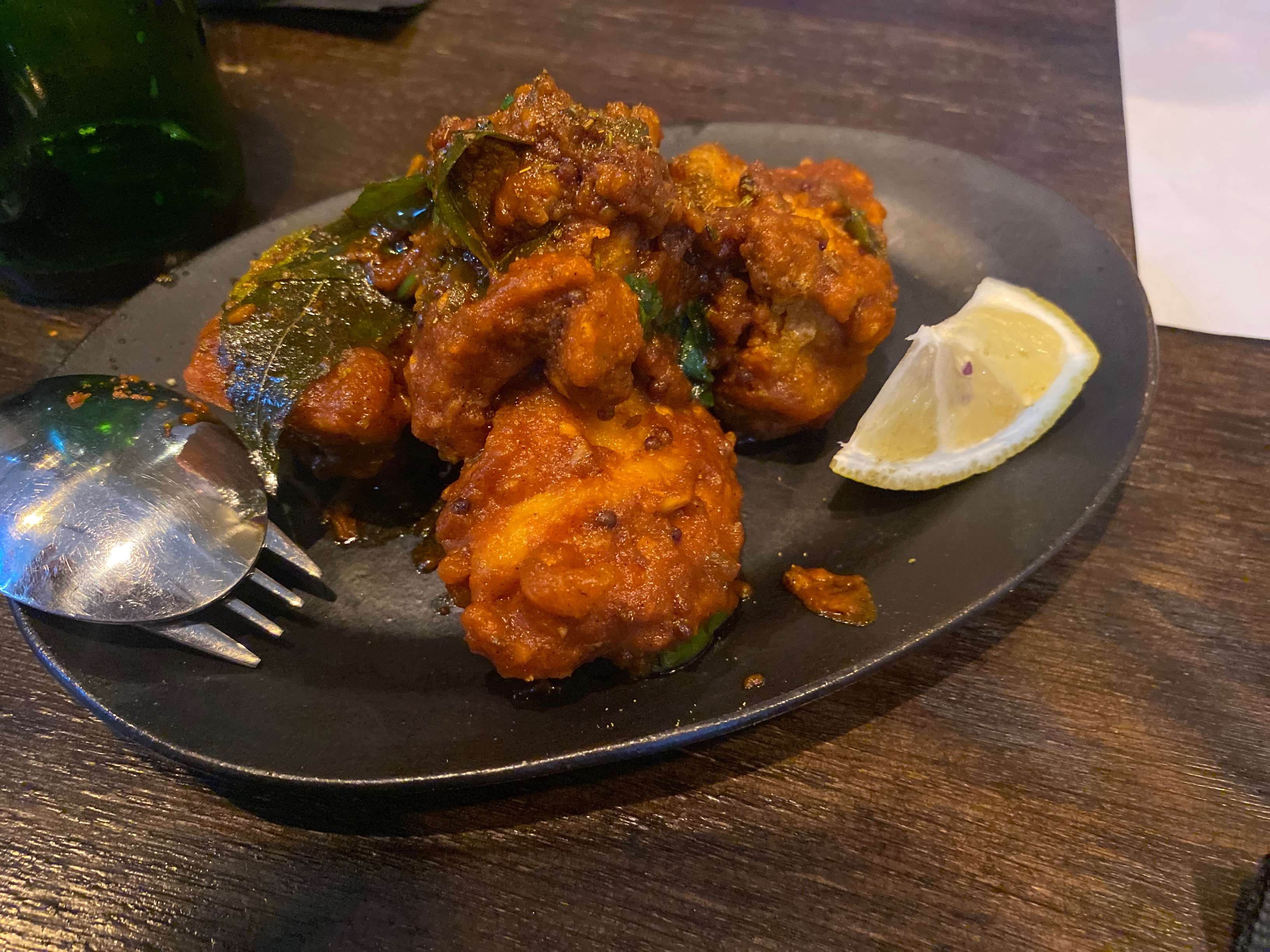 南インドの唐揚げはスパイスたっぷりの甘辛ソースが絡んでいてクセになる美味しさ。