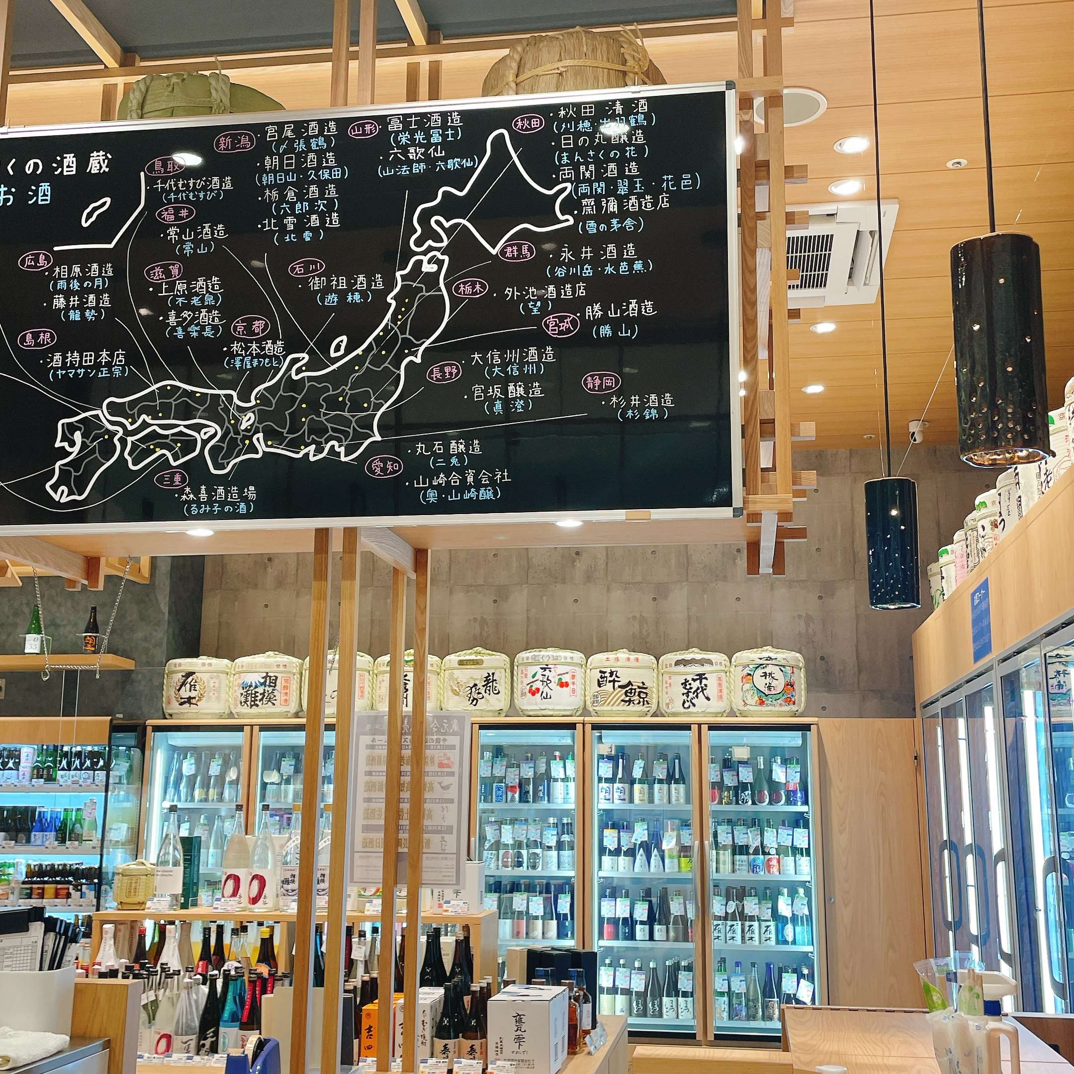 角打ちコーナー上の黒板には日本地図と神奈川県の地図に酒蔵と銘柄が書かれています。