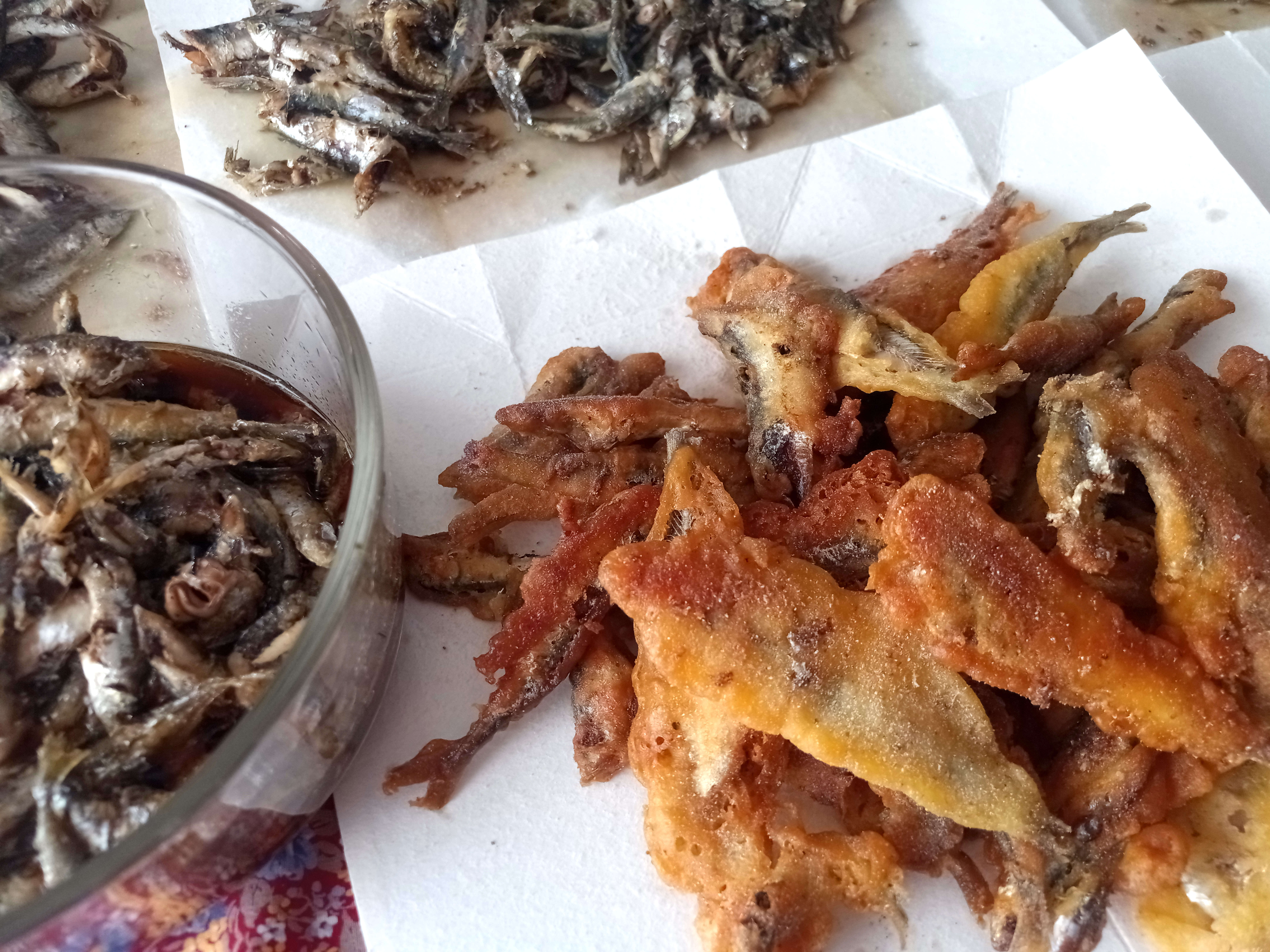 そのまま素揚げでも良いのですが、大きめのお魚は頭とワタをむしる〜などしてから下揚げしました。