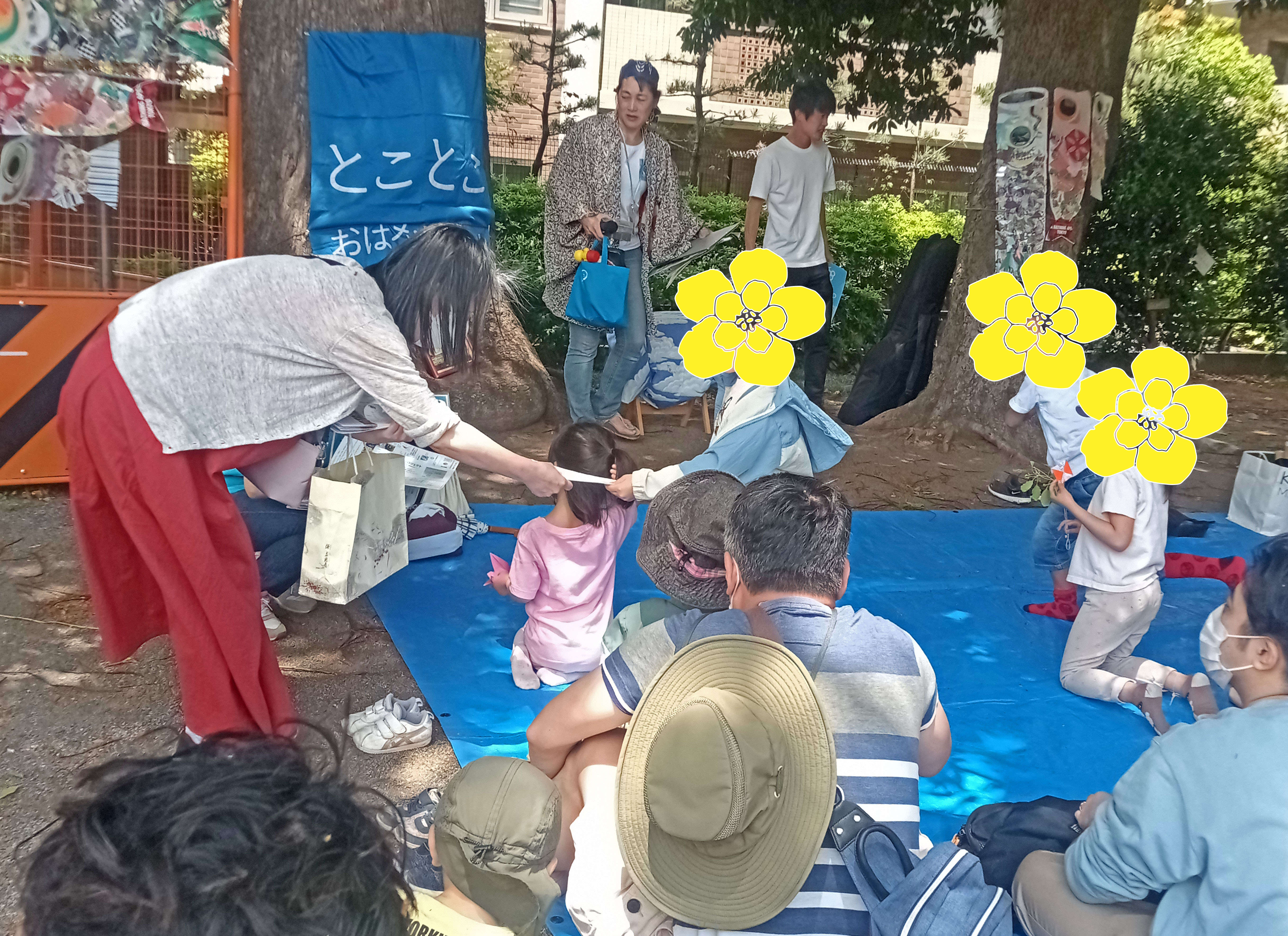 公園でそれぞれ遊んでいたみんなが集まったところで、紙芝居のはじまりはじまり〜。