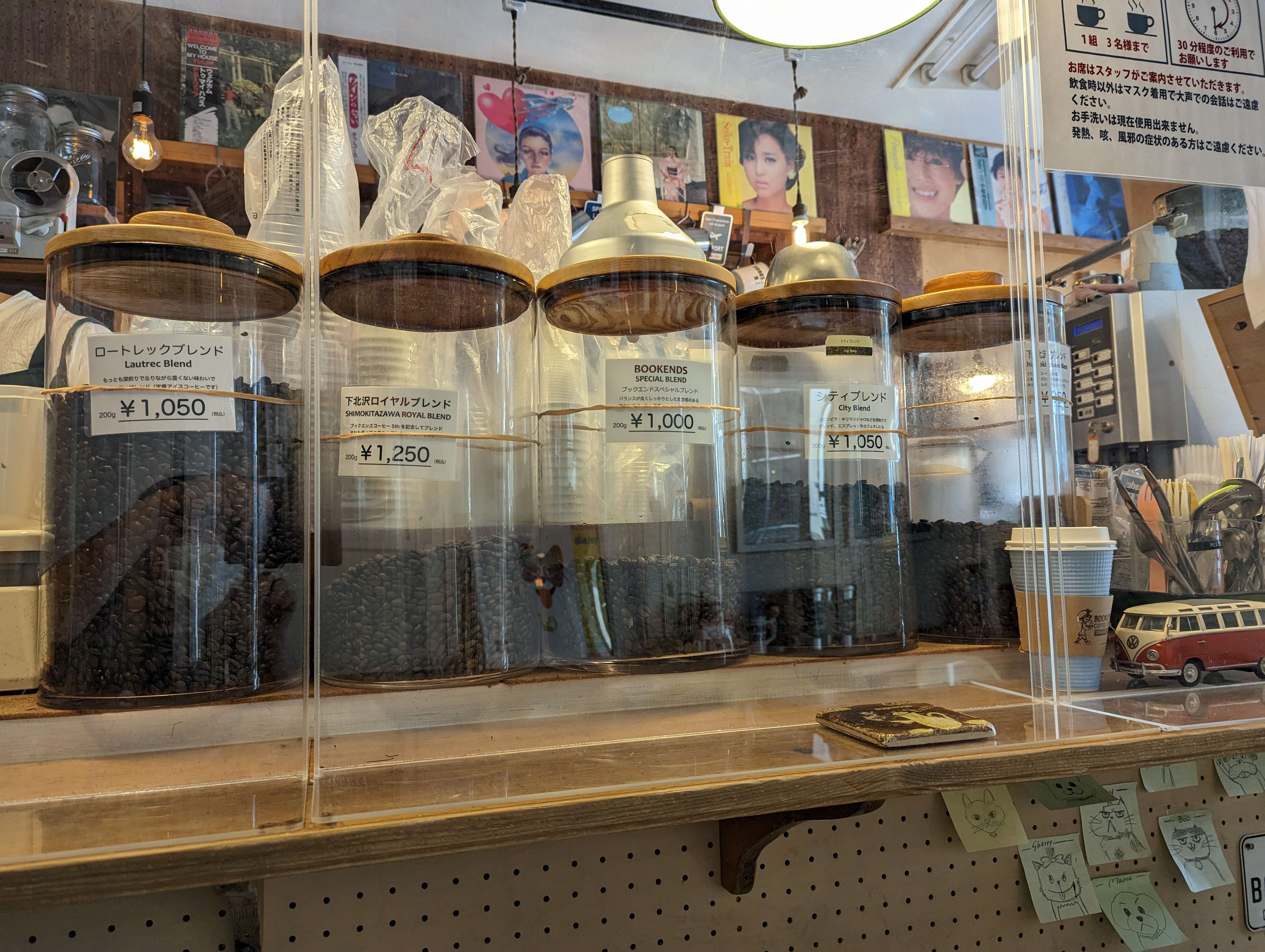 カウンターには、コーヒー豆が円筒のガラスケースに並べられコーヒー好きのわたしには癒やしの空間。