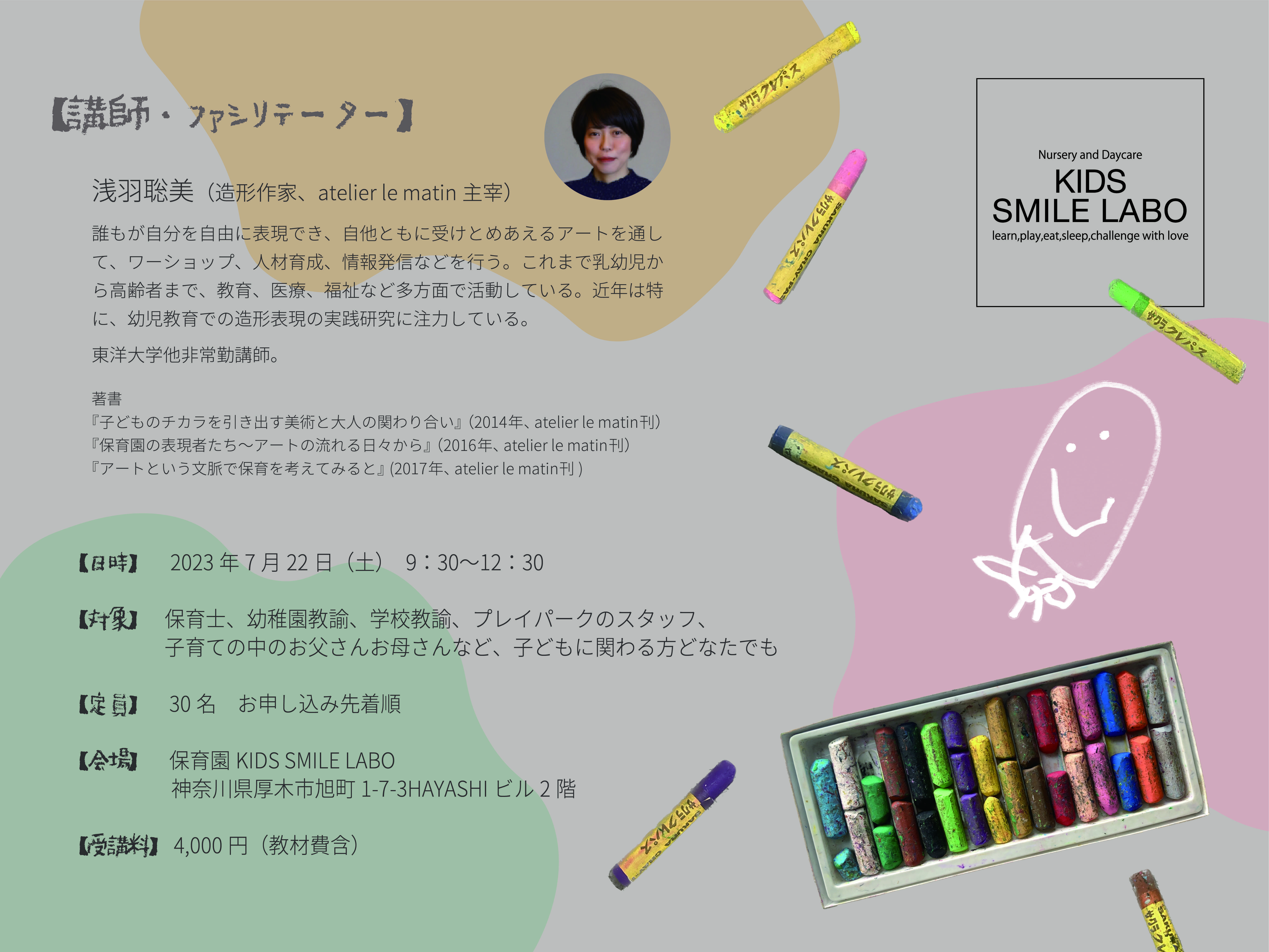 そして、子ども達に関わる私たち大人がワークを通して表現することで心を開放しながら、体験する中で「表現すること」「子どもとアートすること」とは何かをじっくりと味わい、この場に集まった皆さまと想いを共有する時間にしていきたいと思います。