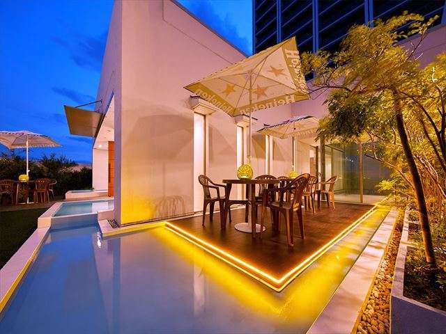 プールには、ウッドデッキが設置されていて日が暮れるとウッドデッキに設置されたテープライトがラグジュアリーな雰囲気づくりに一役買っています。