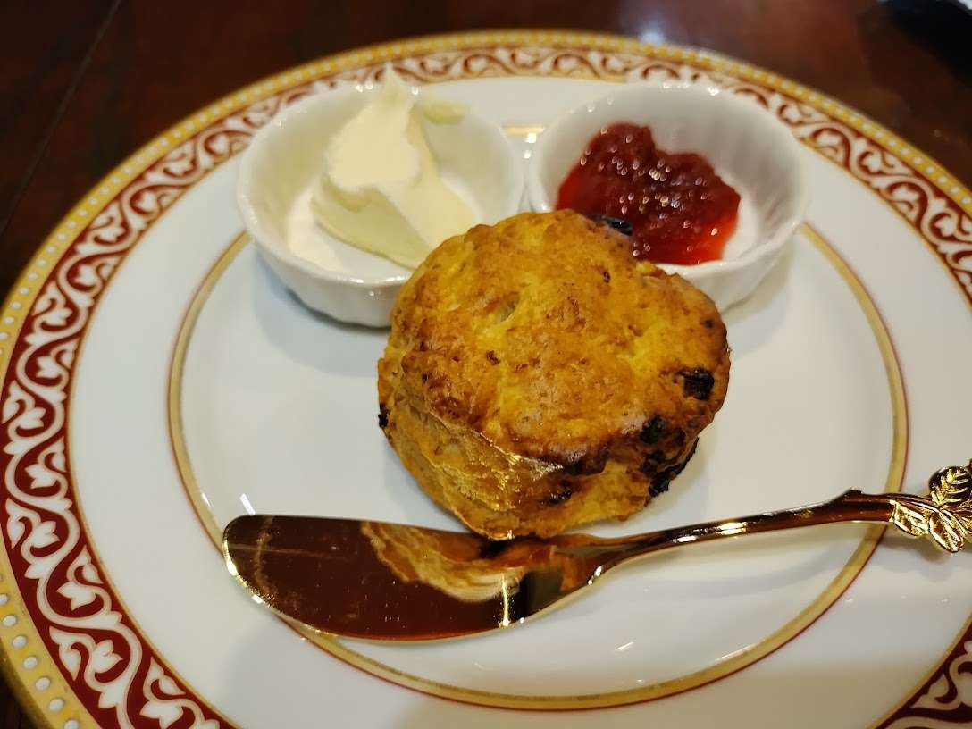 ジャムとクロテッドクリームをつけていただくスコーン、紅茶にぴったりでおいしいですよ。