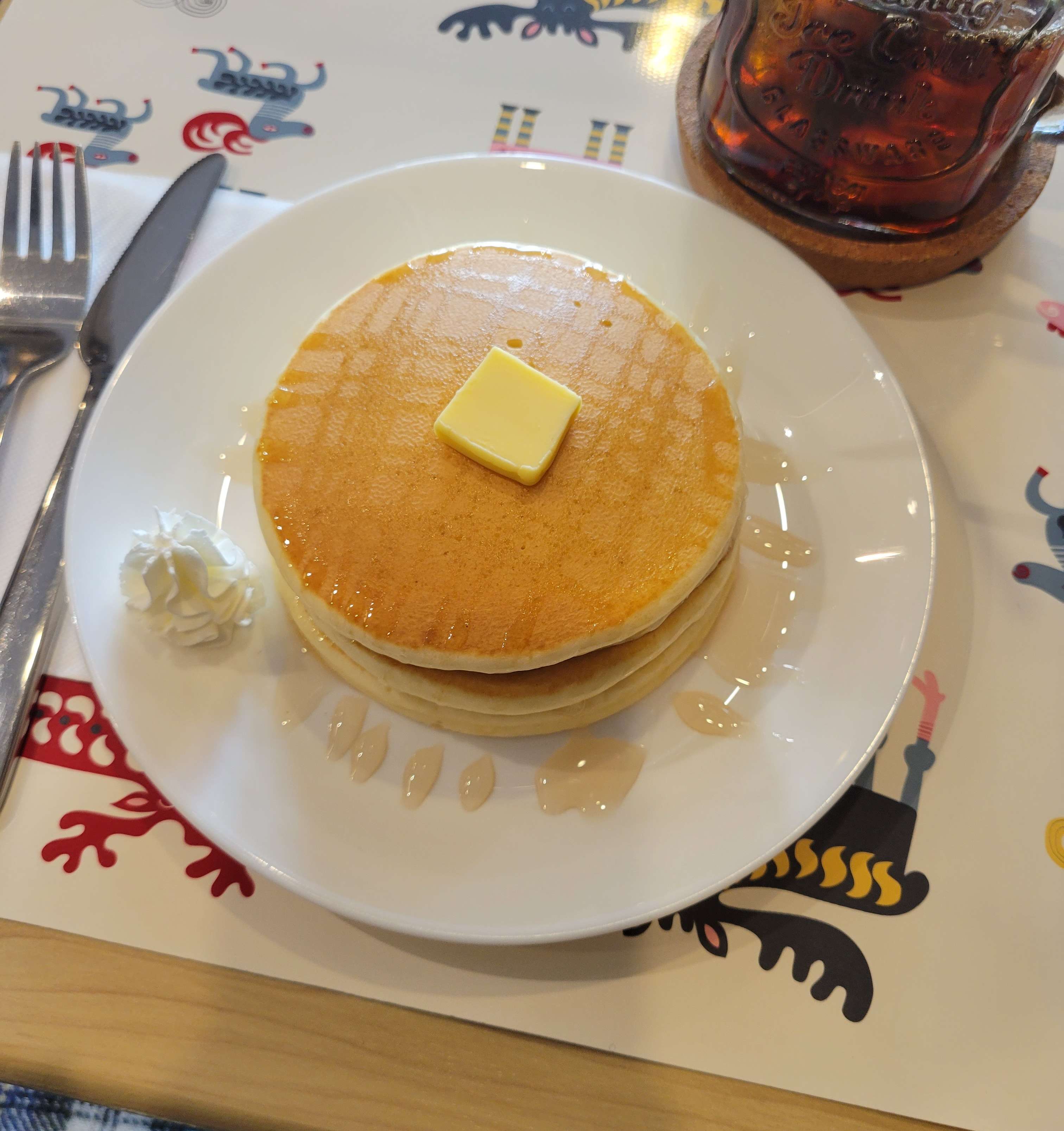 3段重ねに四角いバターが乗った昔ながらのホットケーキは絵本に出てきそうなヴィジュアルでウキウキします!
