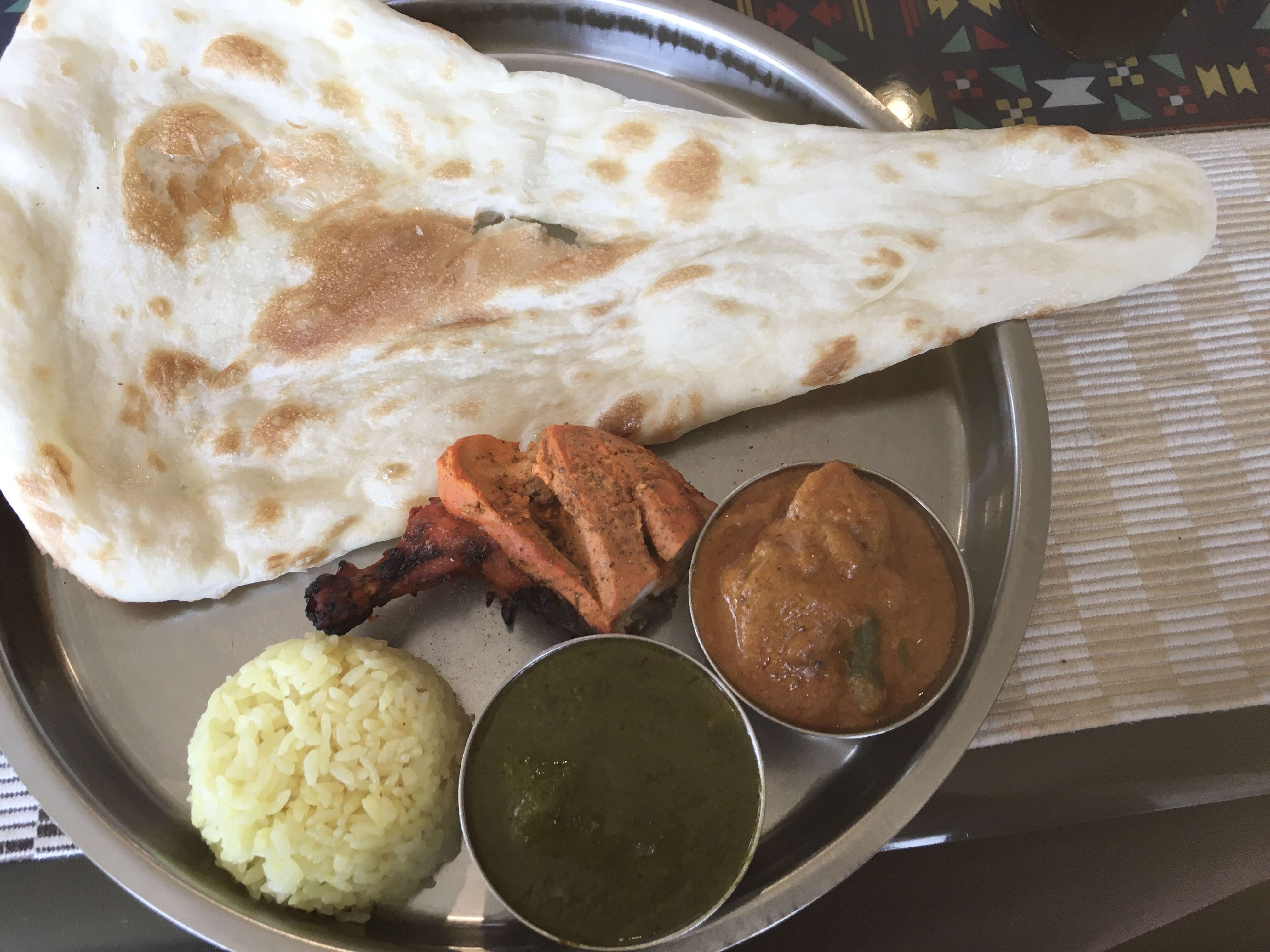 今日はランチセットのカレー2種類とサラダ、チキン、ナン、ソフトドリンク付きの¥1150のセットを食べました。