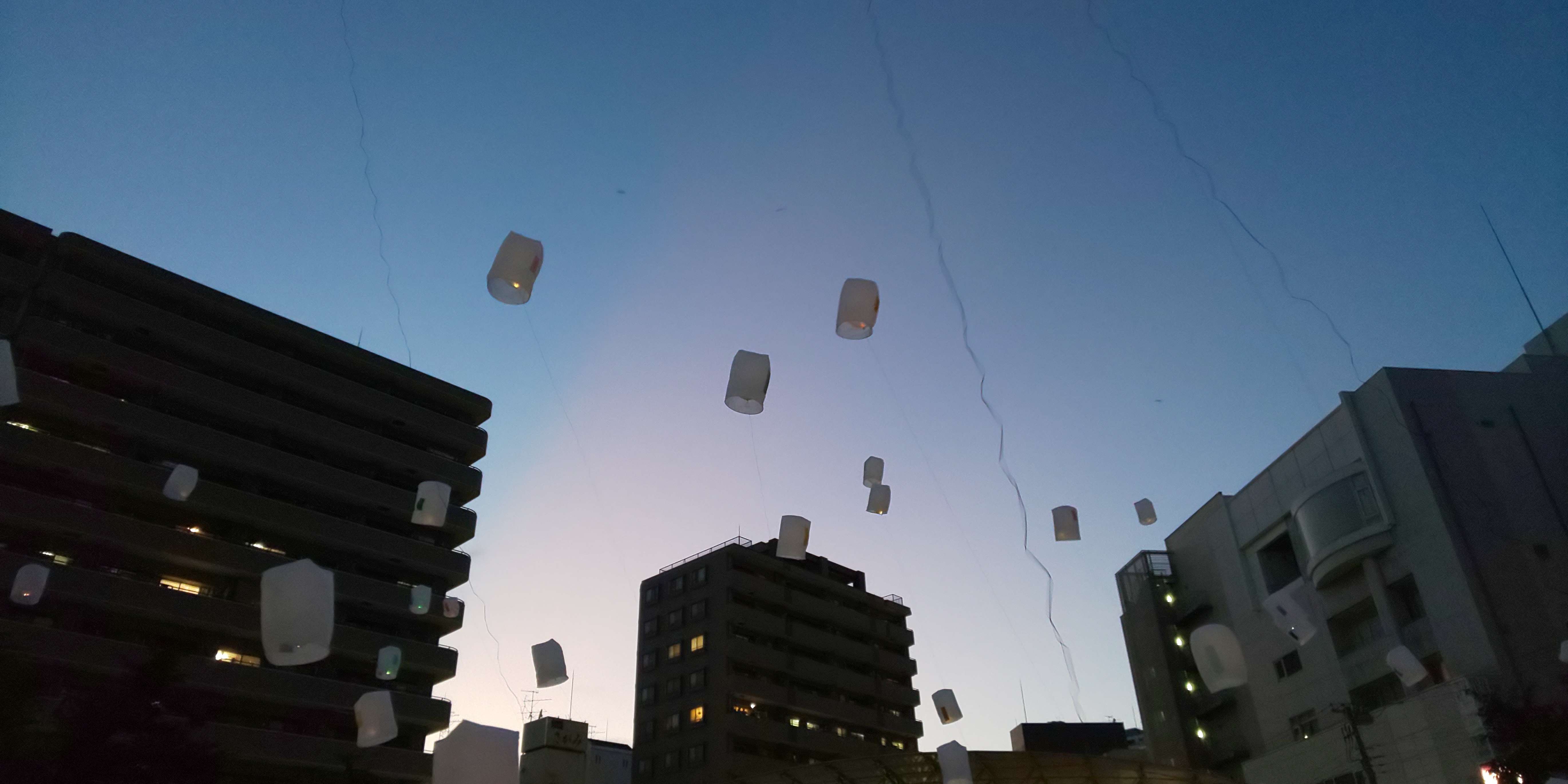 スカイランタンはLEDで光らせ、ヘリウムガスの入った風船で紐をつけて飛ばしました!