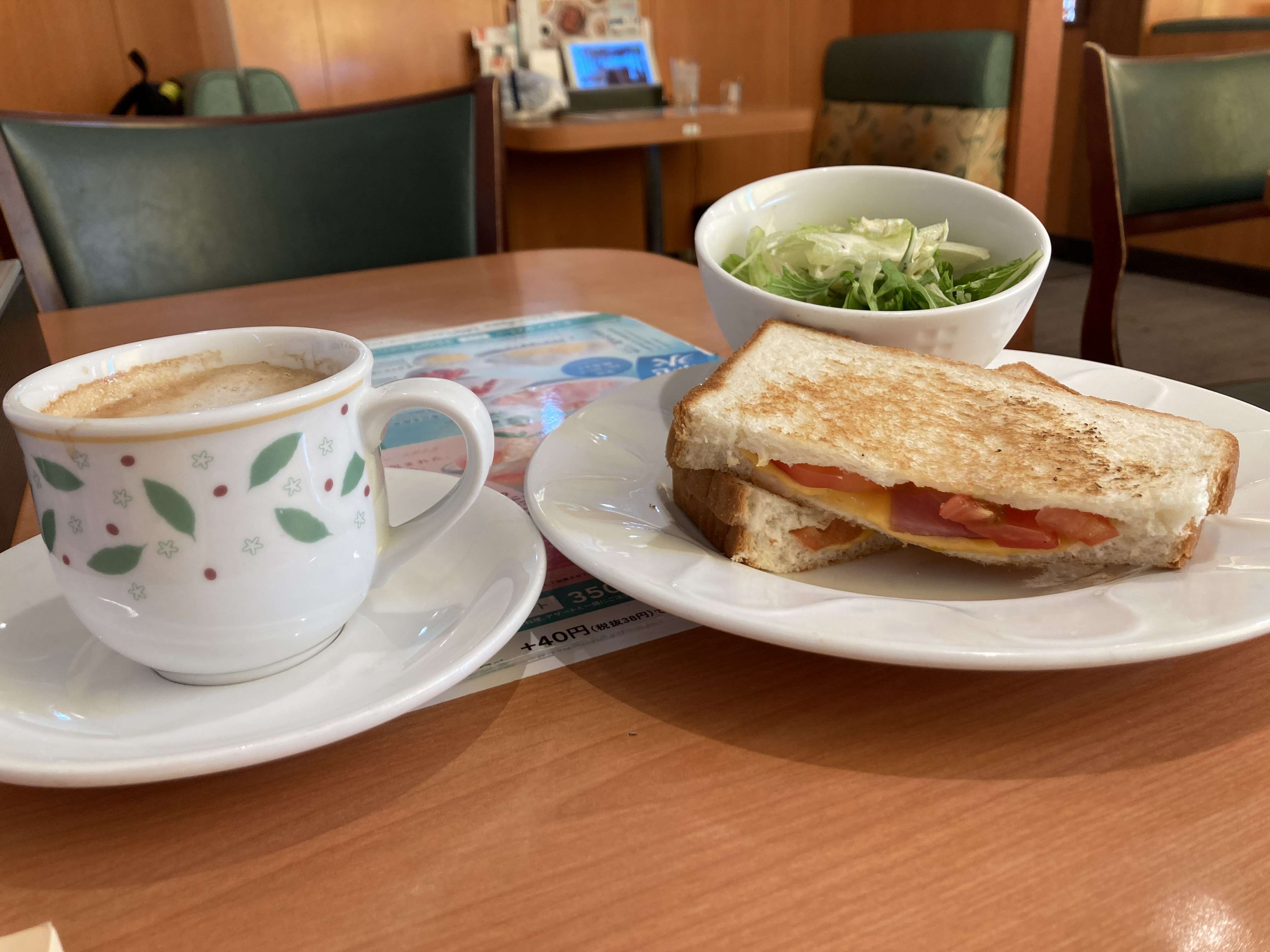 トーストされたパンに、トマト、チーズ、ベーコンがサンドされていて美味しい〜。