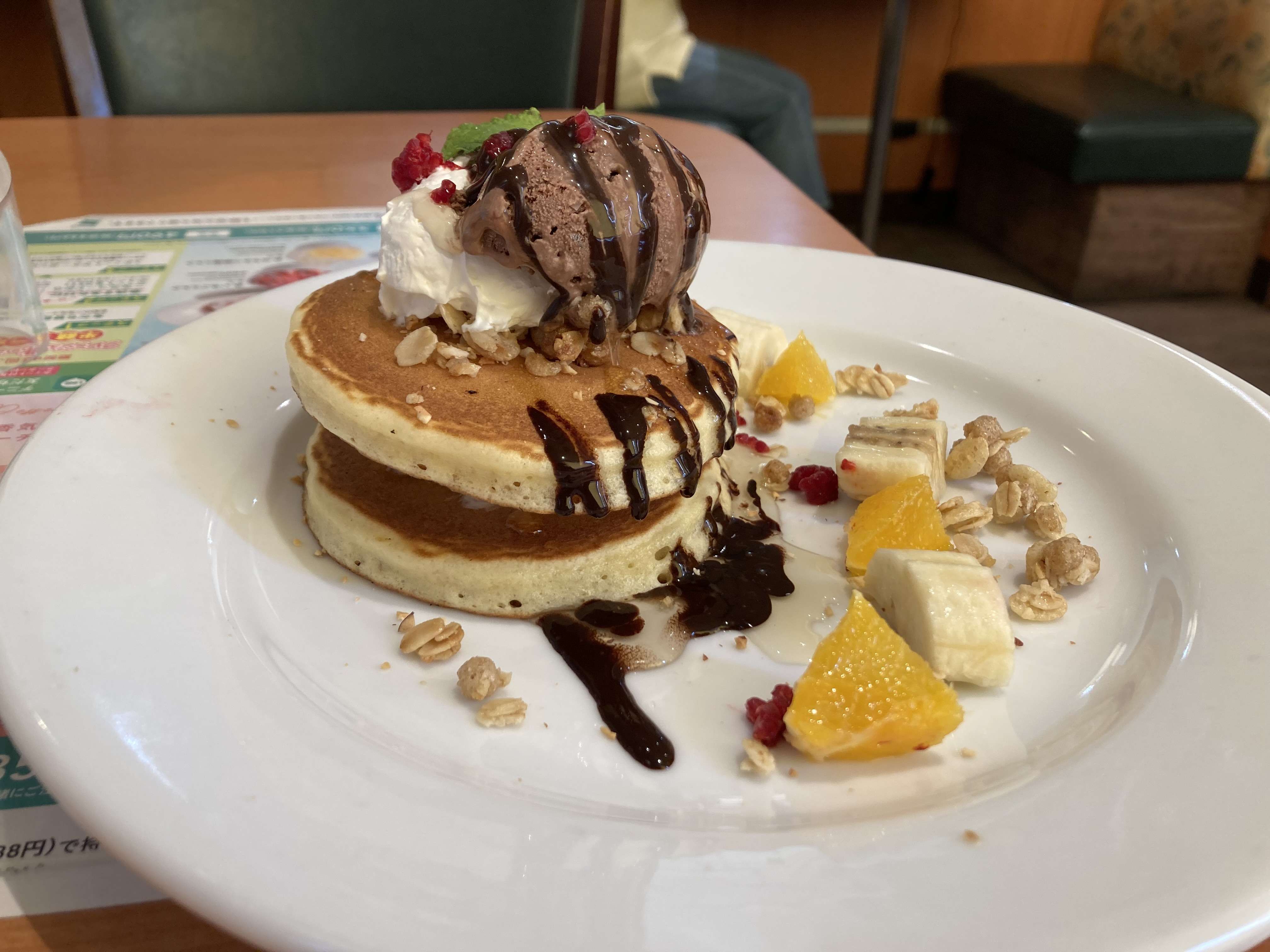 パンケーキ2枚にクリームやチョコレートアイス。フルーツなどもトッピングされていて豪華!