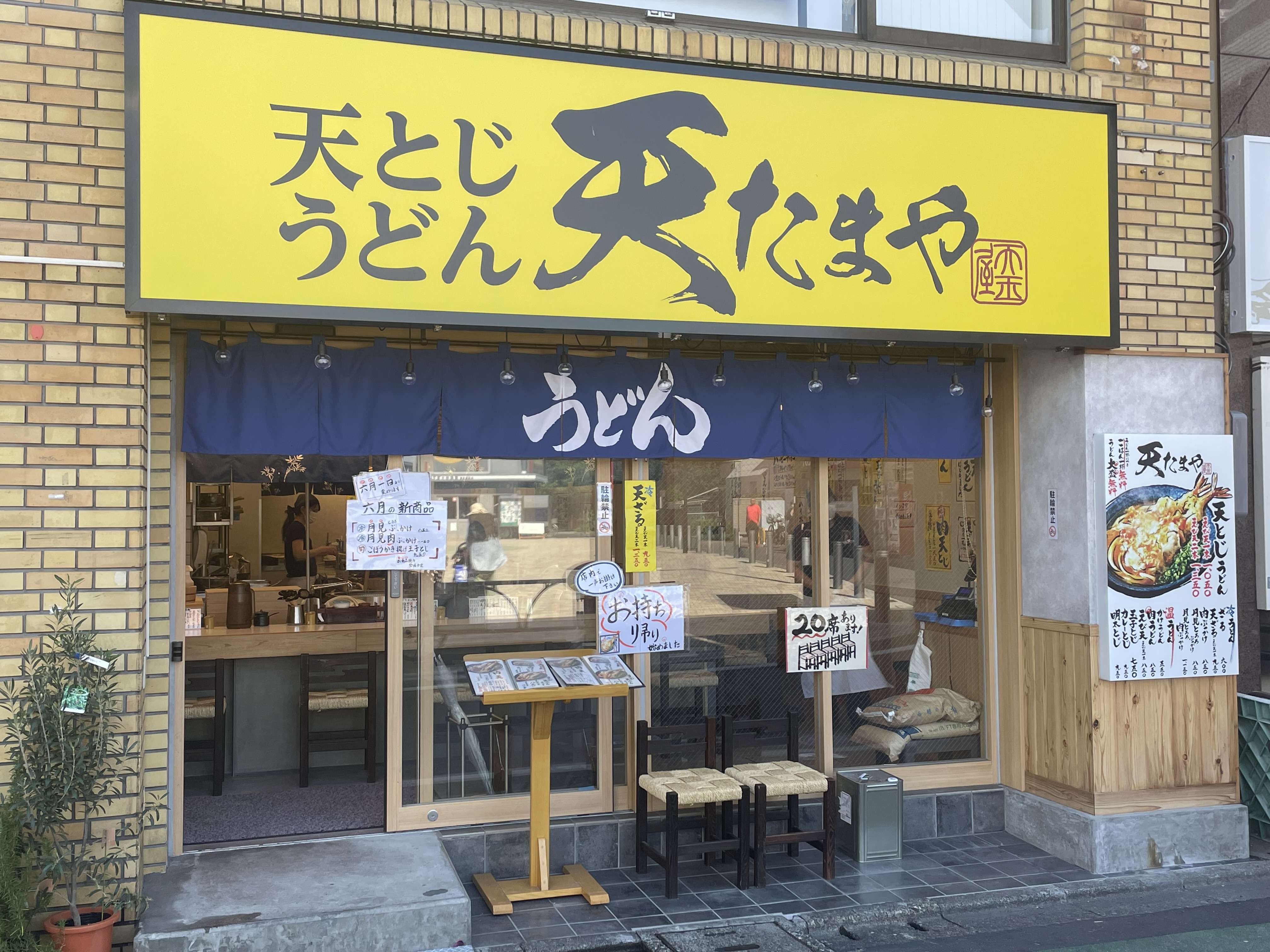 祖師ヶ谷大蔵駅出ると眼の前に黄色い看板、2023年4月にオープンした天とじうどん「天たまや」です。