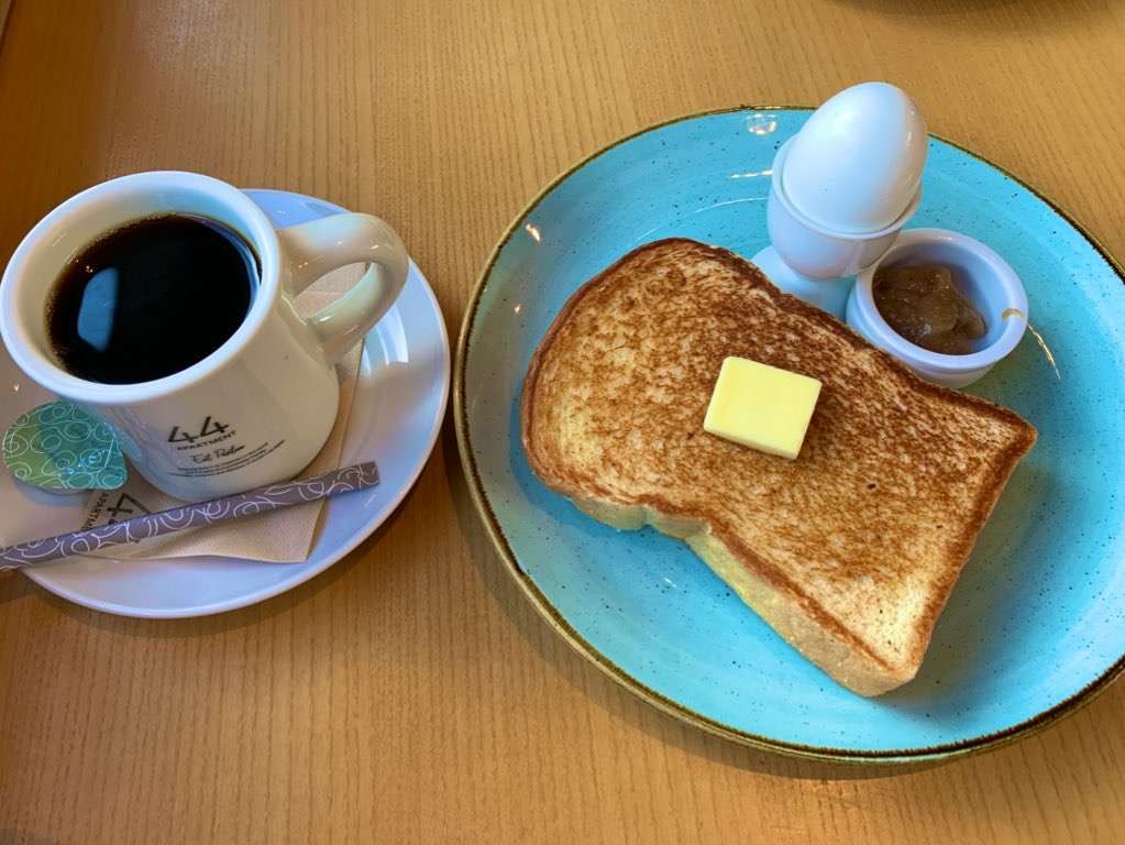 モーニングセット 480円(税込 528円)はトーストにゆで卵、バナナのジャムがついていました。トーストがサクサクでジャムをのせておいしく頂きました。