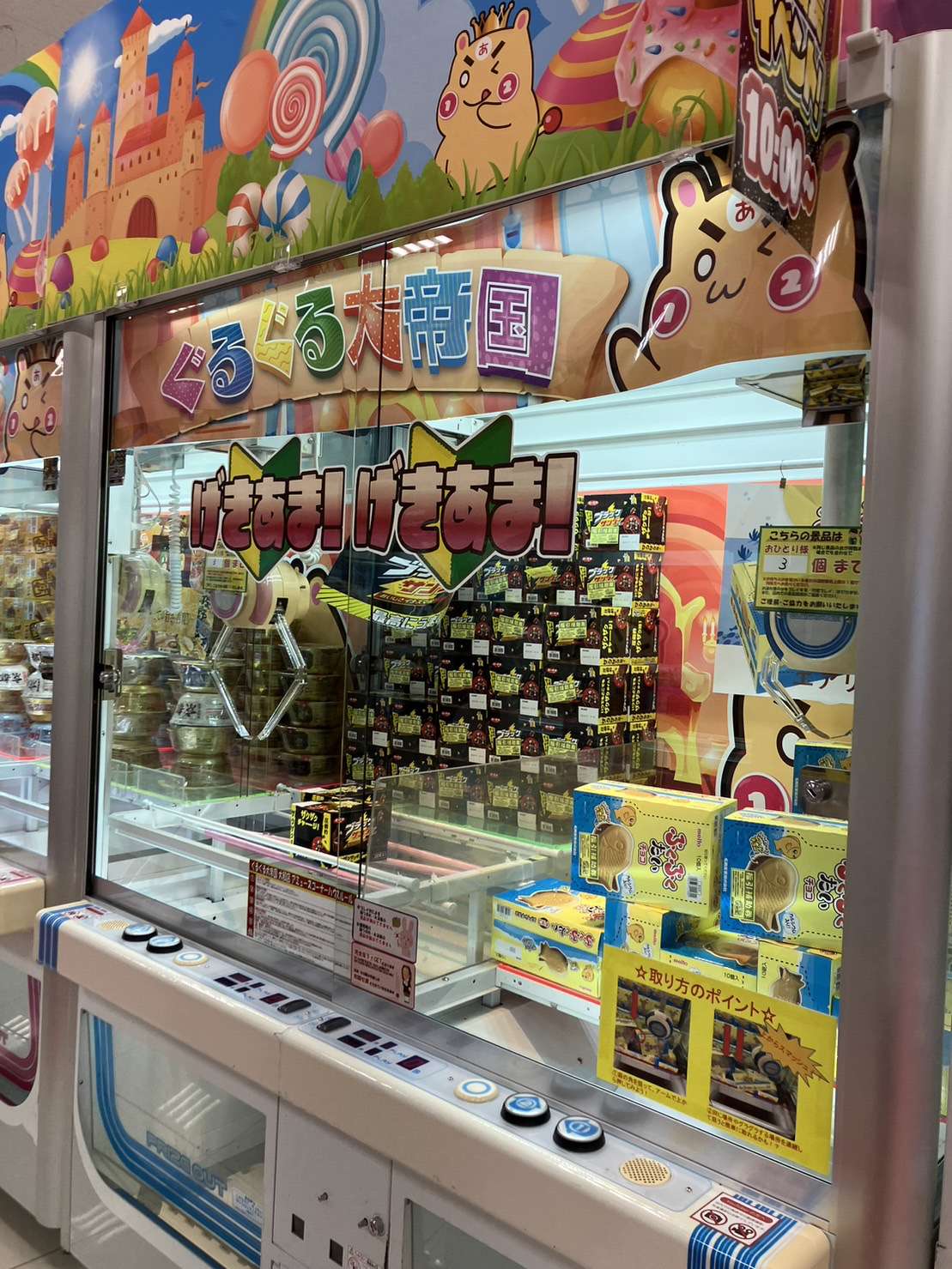 キッズコーナーと表示のある場所にある10円からできるクレーンゲーム。
