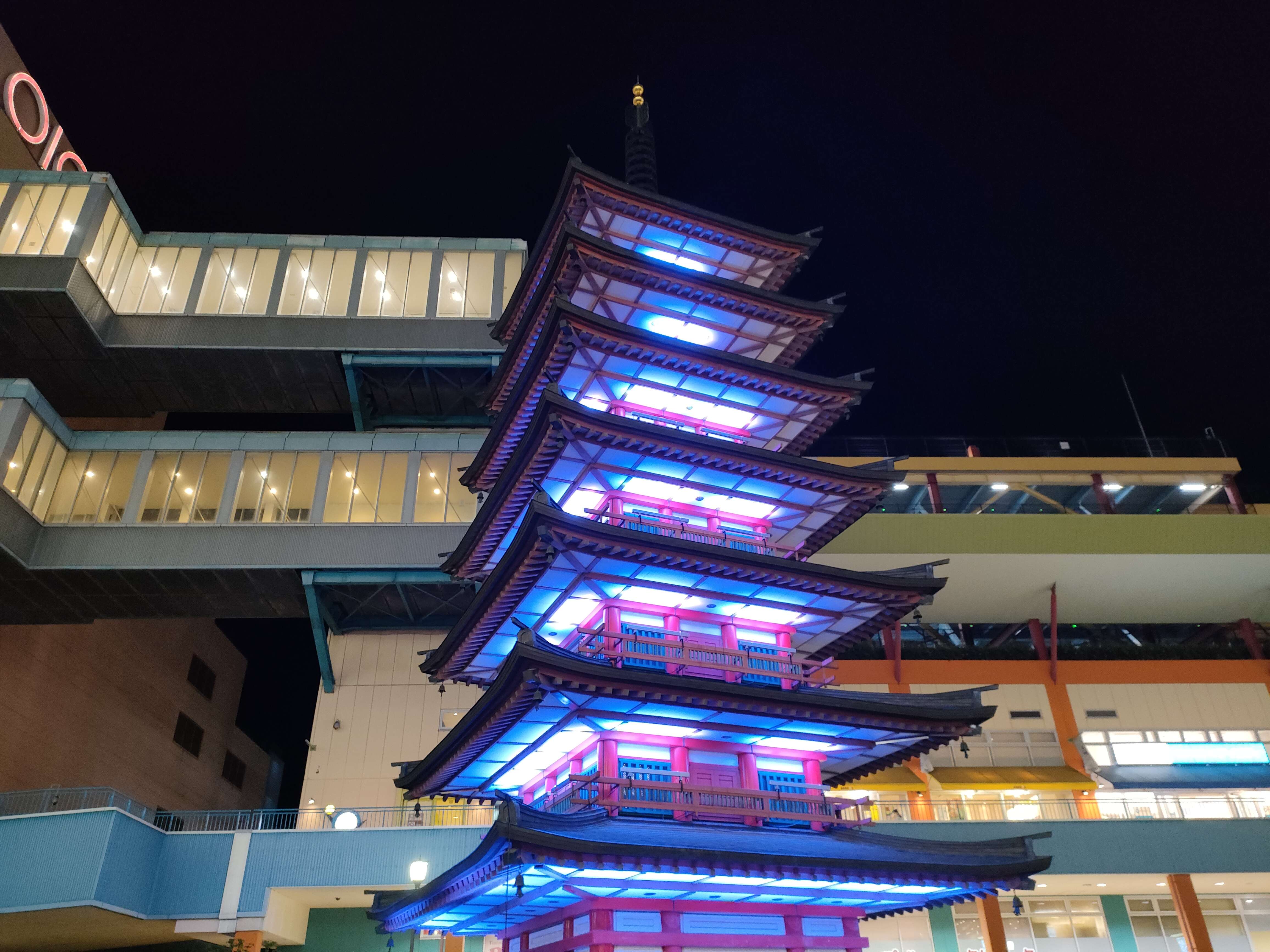 普段は赤い七重の塔がカラフルに変化していく姿はとても綺麗。思わず足を止めて眺めてしまいました。