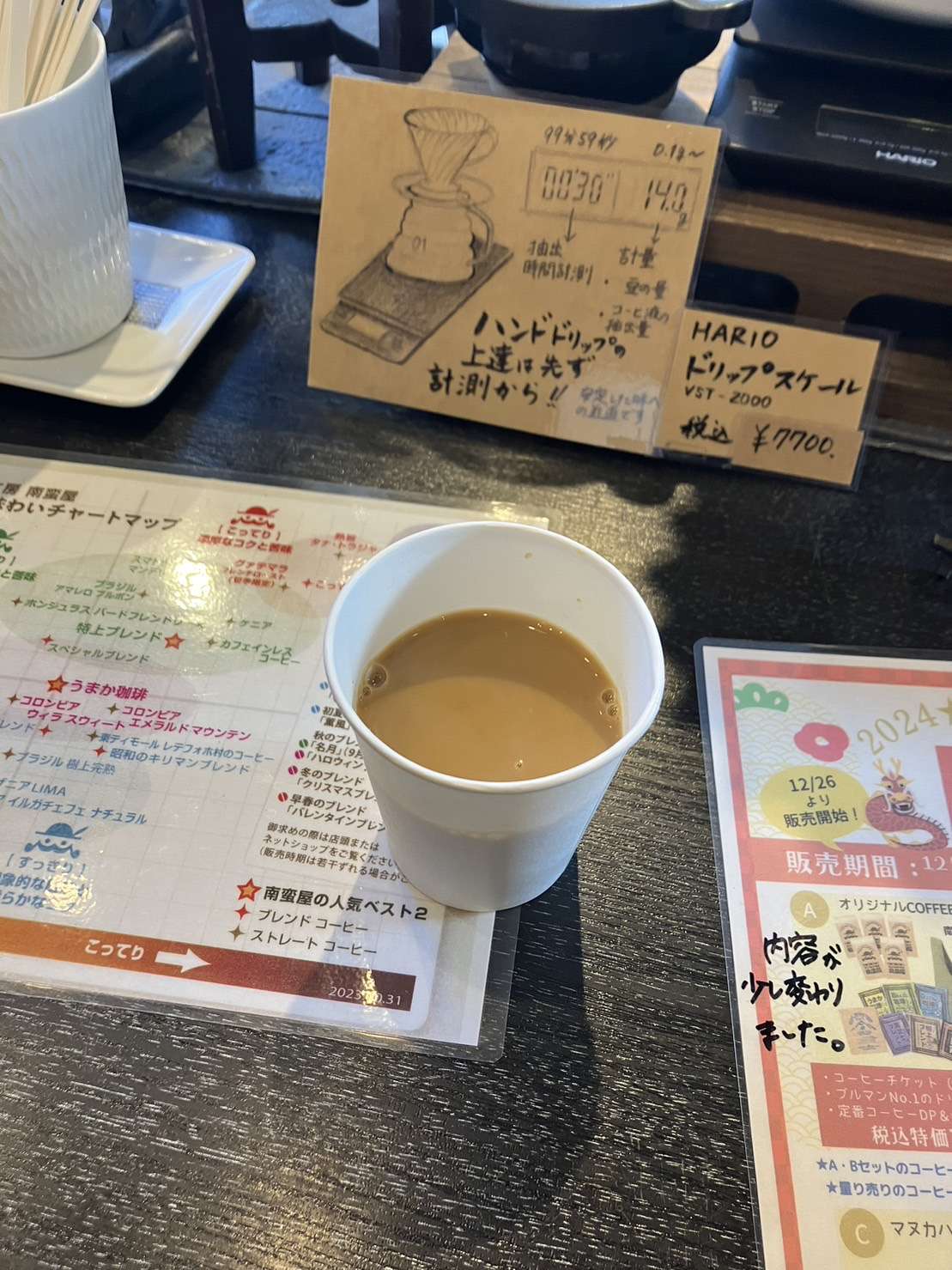 種類を選んでコーヒーを挽いてもらう間に試飲用のコーヒーをいただけます
