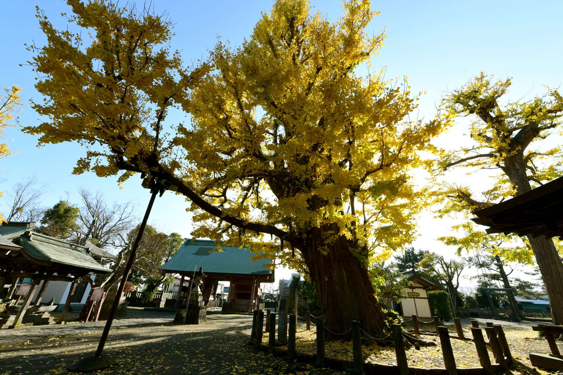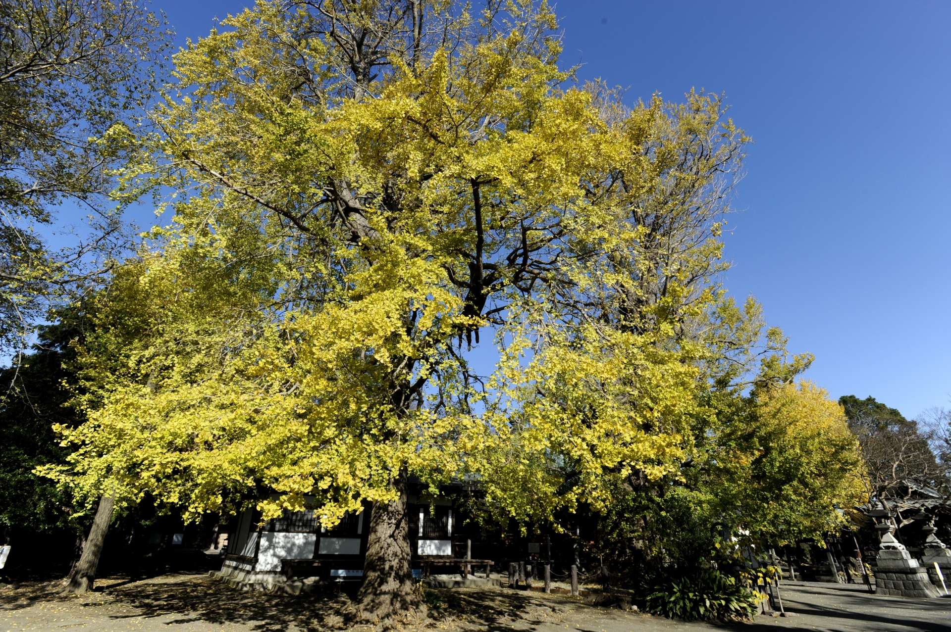 こちらは神奈川県の天然記念物に指定されており、樹高30m、幹囲7.5mと県内最大級でその姿は圧巻です。主幹は風によって数回折れていますが、地上7~8mの所から5本の枝に分かれて次々に再生。それぞれ100年以上経過していると思われ、現在の立派な姿を構成しています。この再生枝はいずれも旺盛なので、黄色く色づく時期は少し遅くなる傾向にあります。