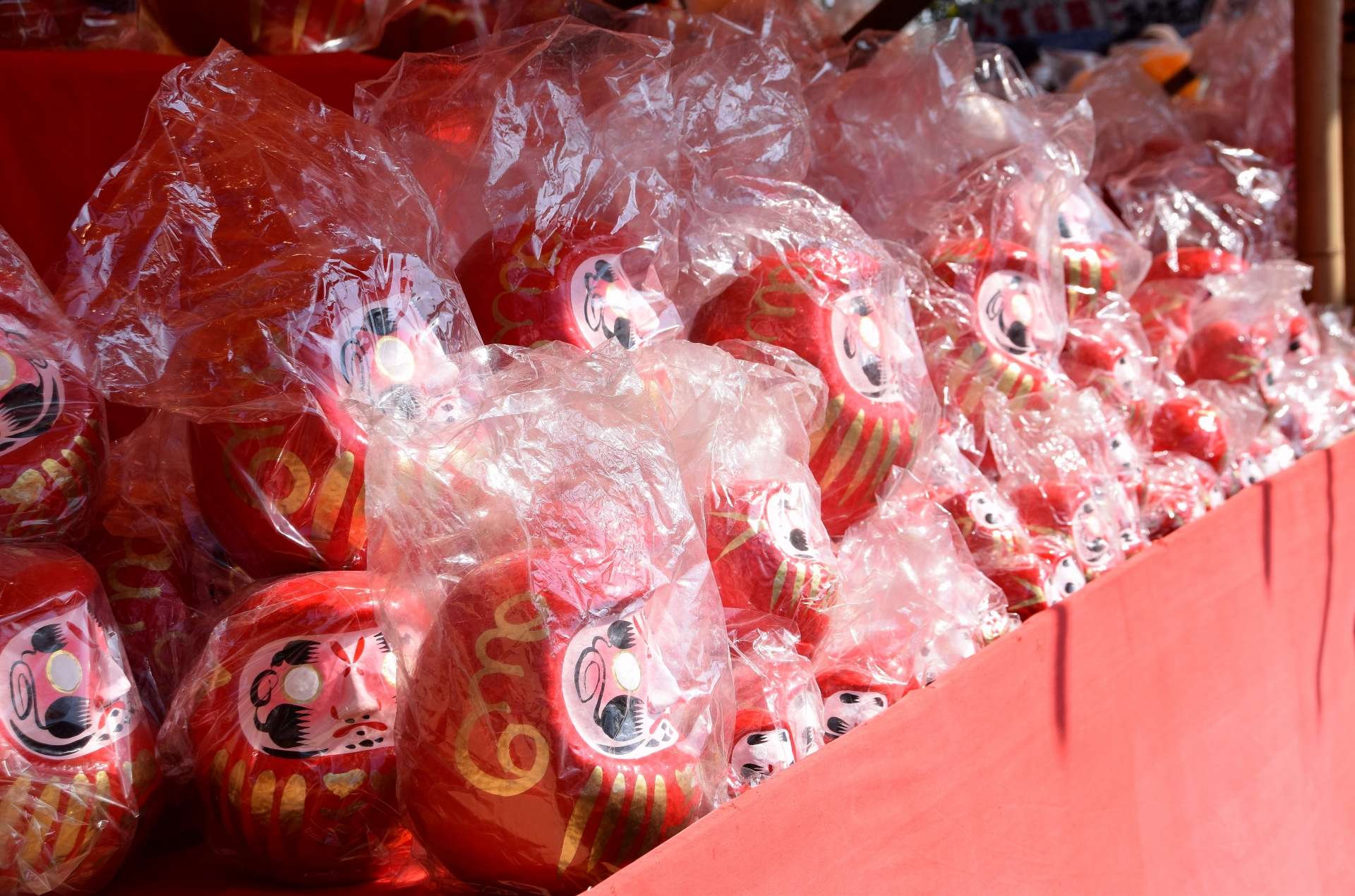 その歴史は古く、400年以上前の江戸時代から続きます。当時、勝福寺周辺は生活用品を扱う商店が集まる門前町だったそう。お正月の準備の時期になるとだるま店が並ぶようになったのが「飯泉観音だるま市」の始まりと言われています。