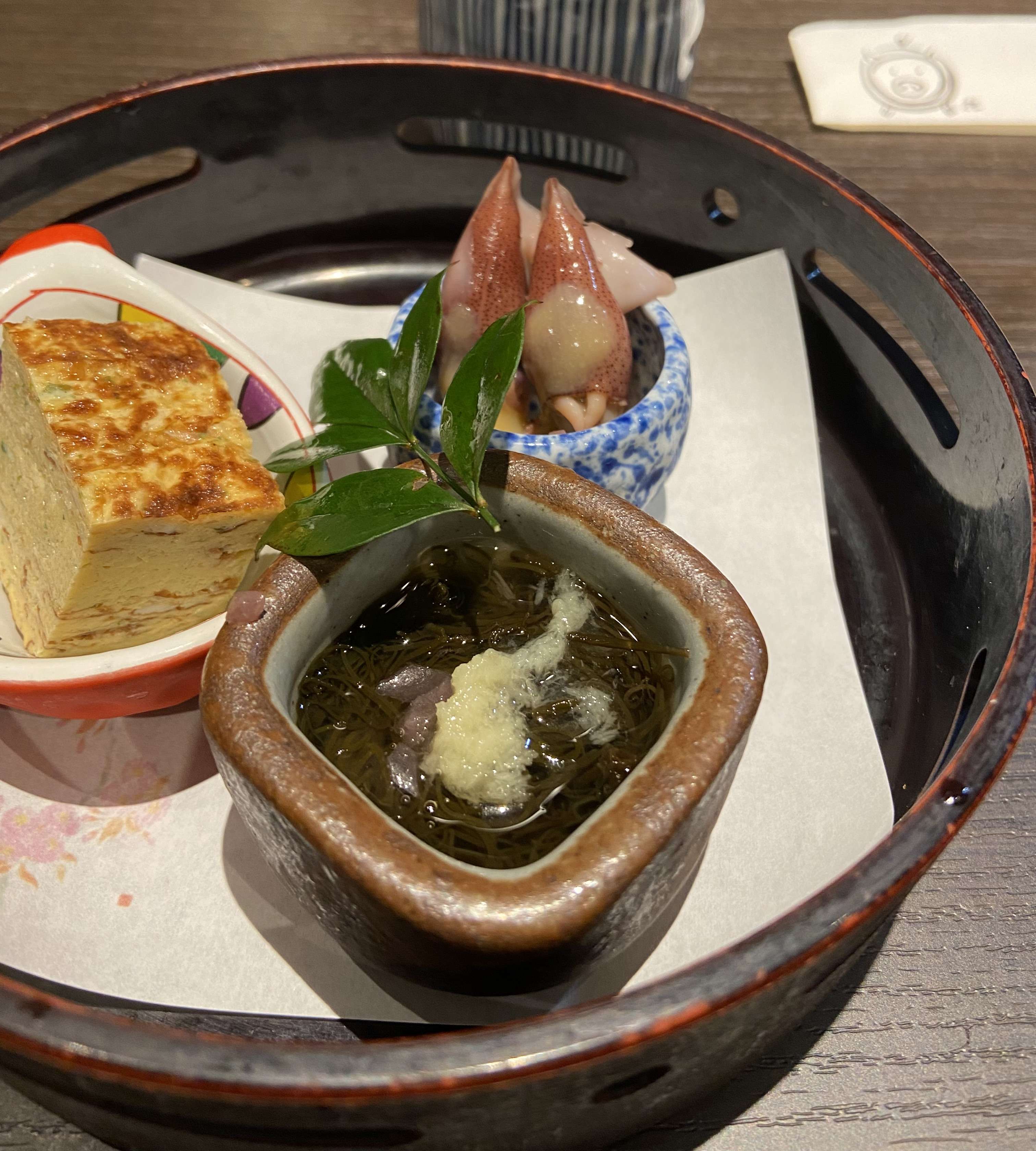 つきだし(お通し)から始まり、お造りや煮物などが少しずつ楽しめて、赤だしとデザートもつきます。