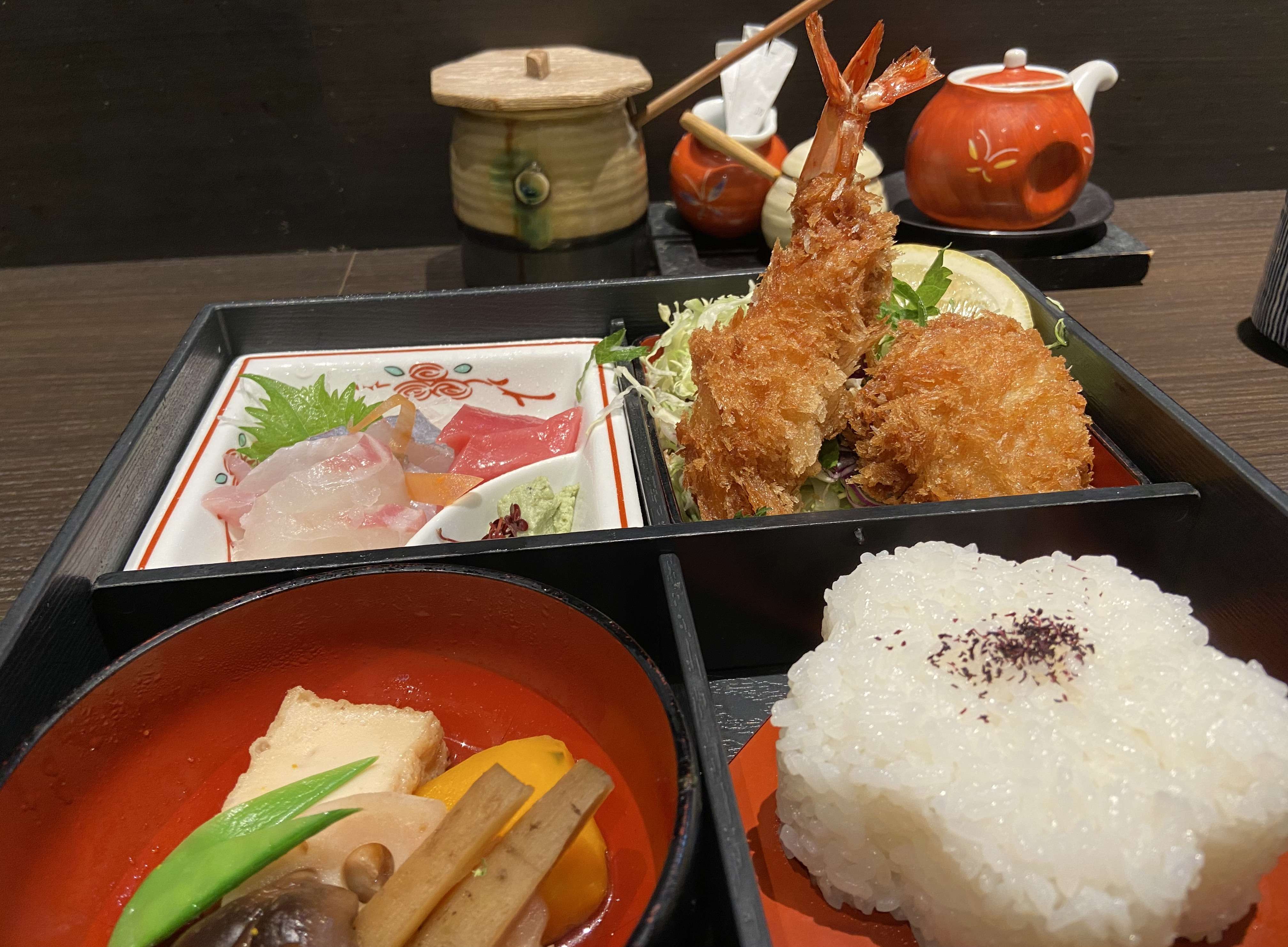 写真には写っていませんが、赤だしがつきます。しっかりとお出汁が効いていて、揚げ物やお造りとも相性バッチリです。とんかつもエビフライも衣サクサクです。