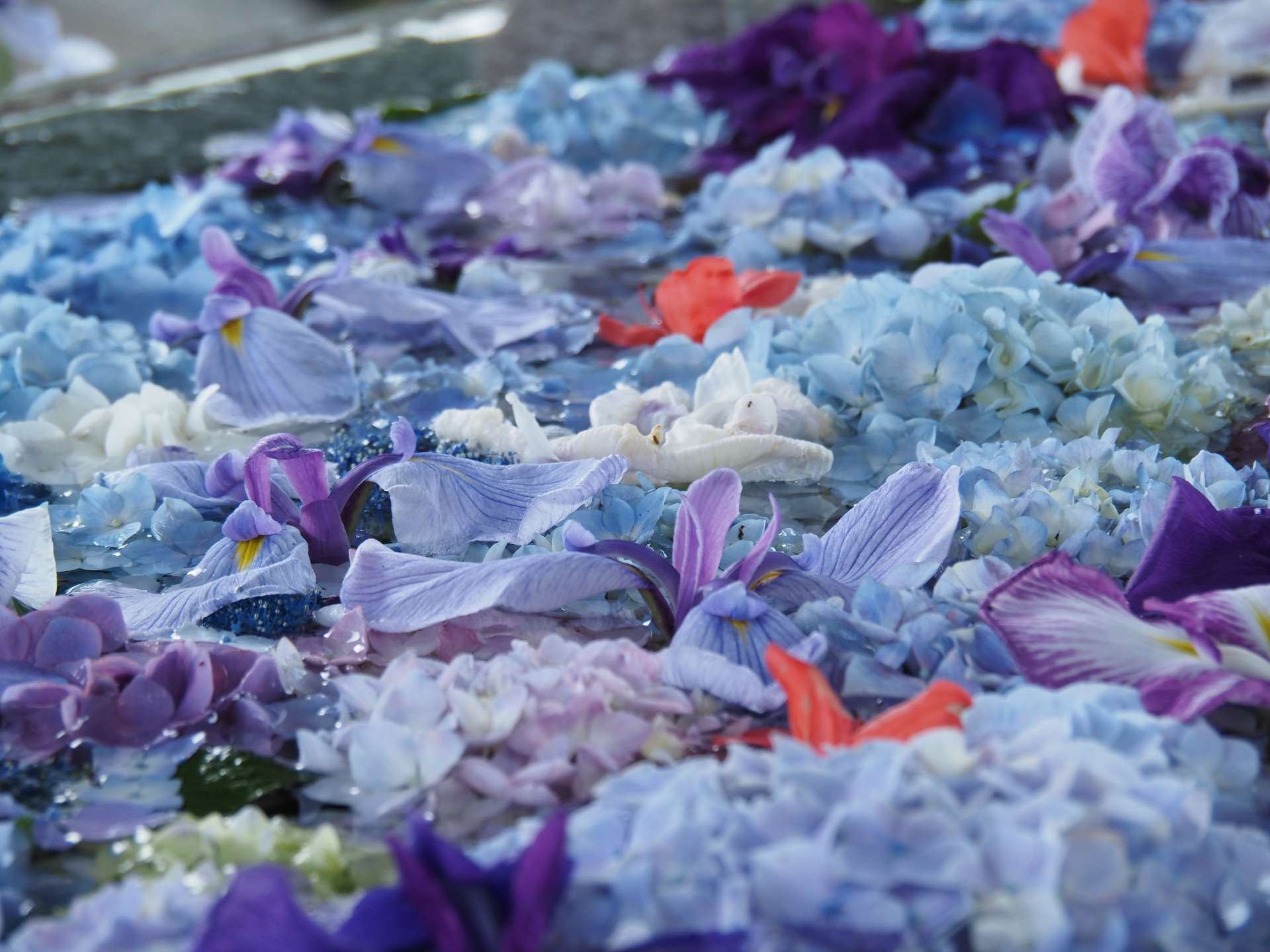 この時期には季節ならではの楽しみとして、手水舎にアジサイを浮かべる「花手水」や「御神水に浮かぶアジサイ」が見られるかもしれません。青と紫のグラデーションからは、芸術品のような美しさを感じられますよ。