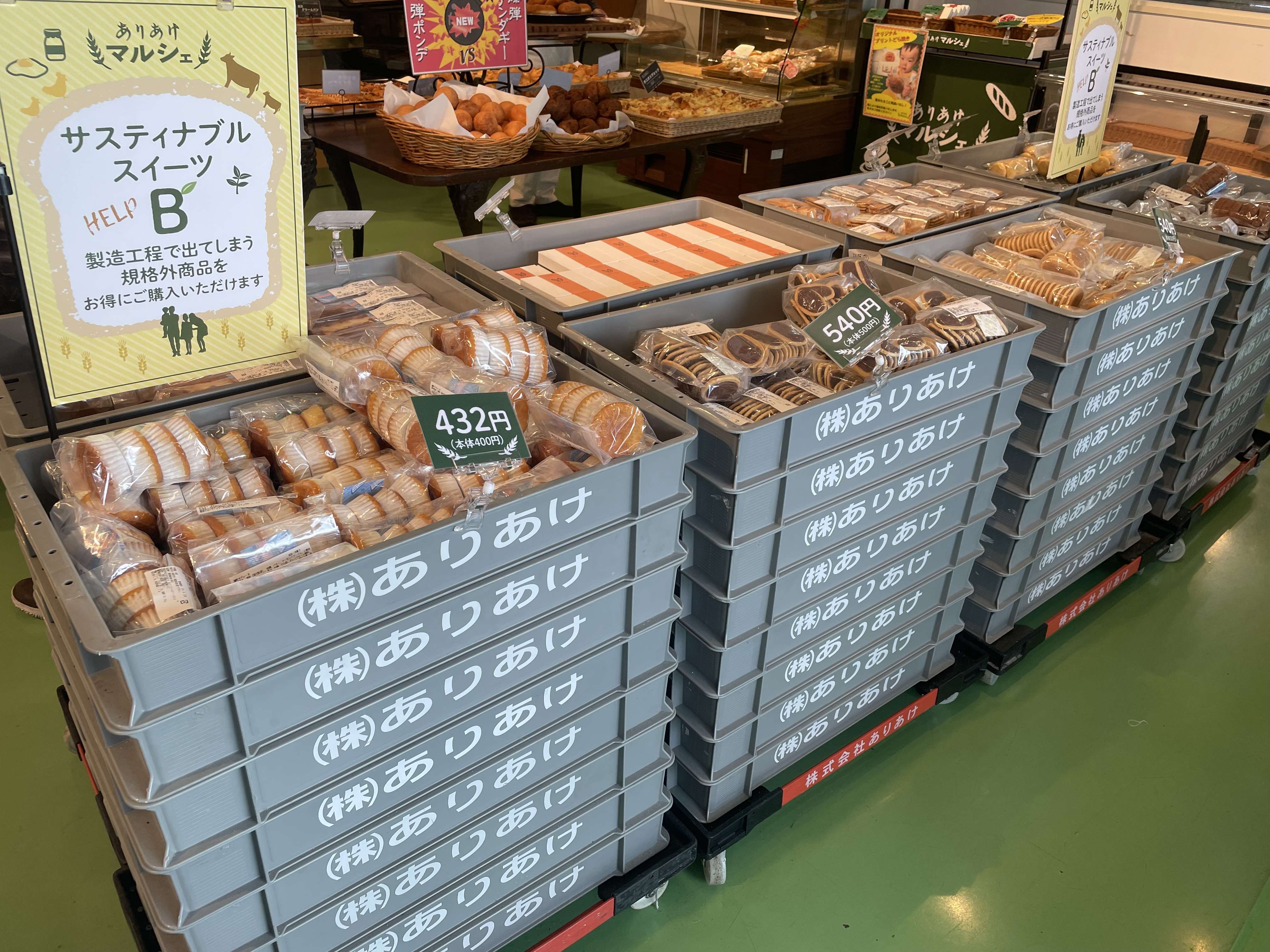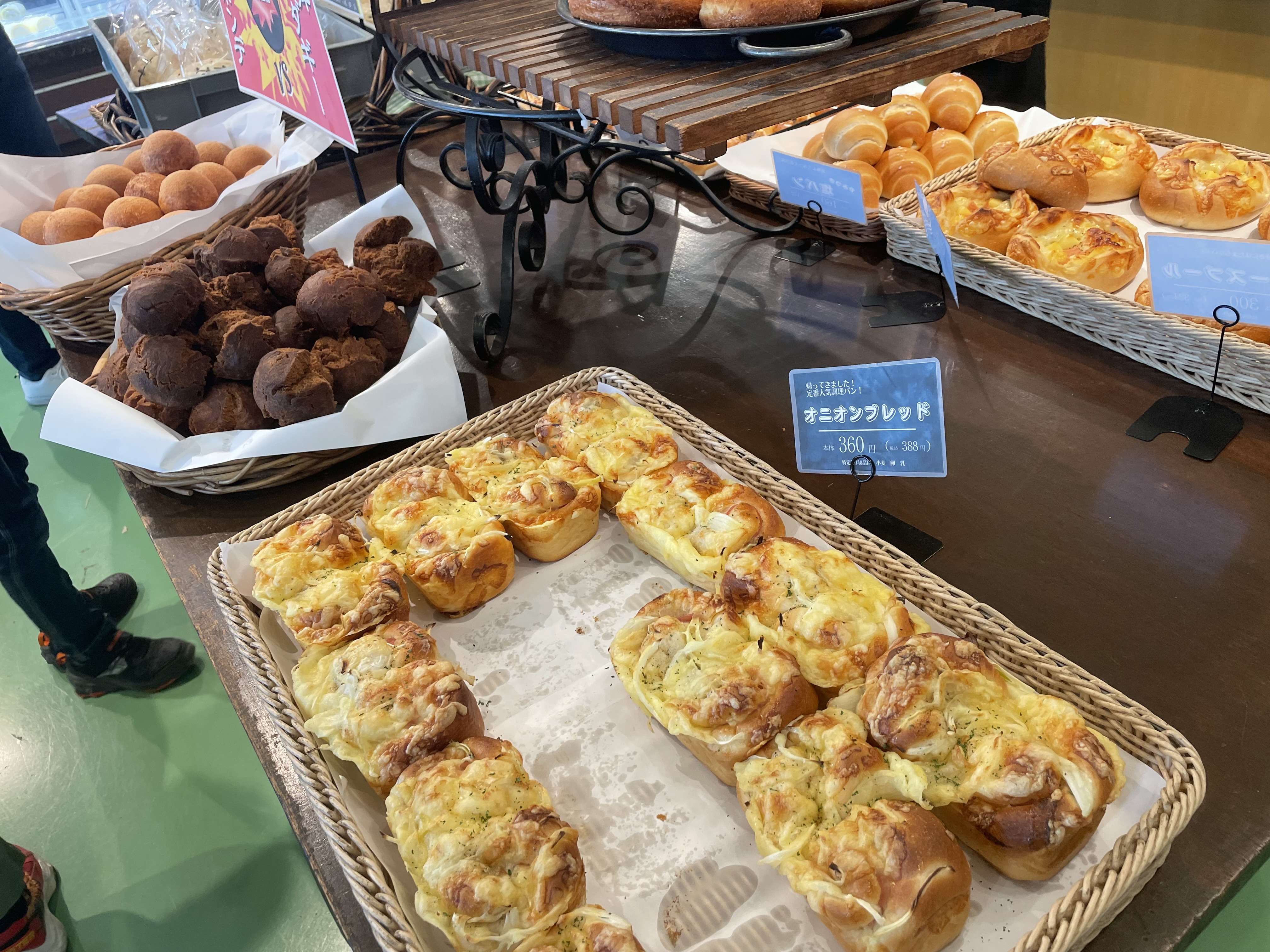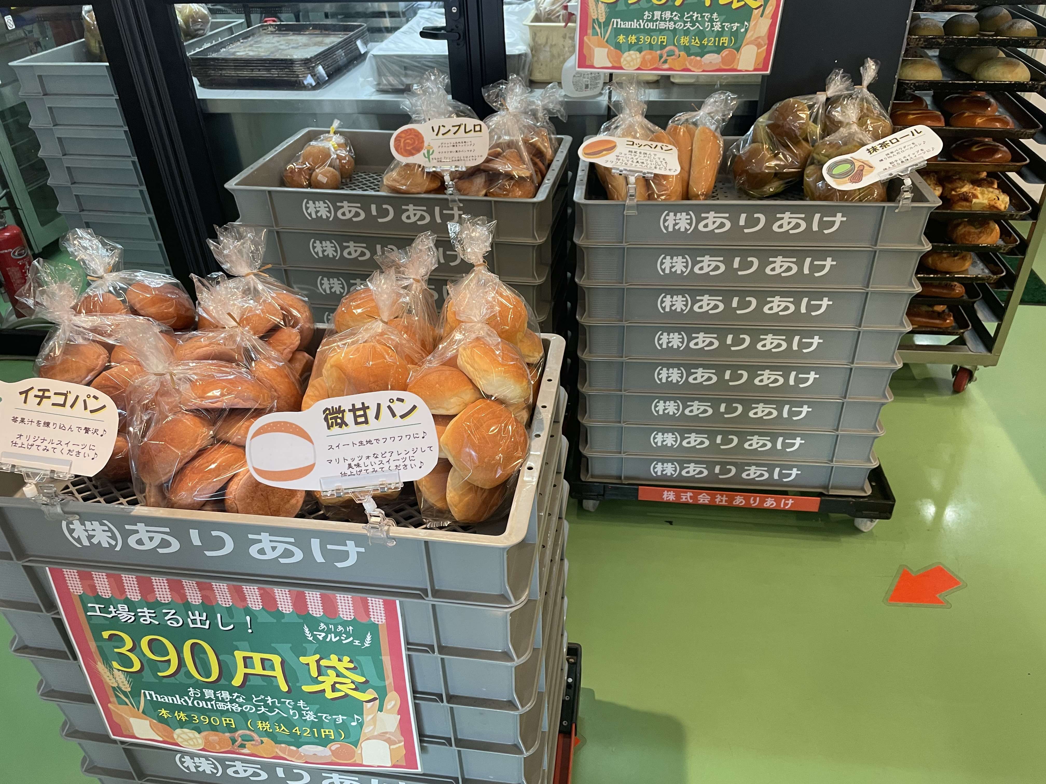 工場直出しの、焼きたてパンはもちろんのことアウトレット品、クッキー、ロールケーキなどが並びます。