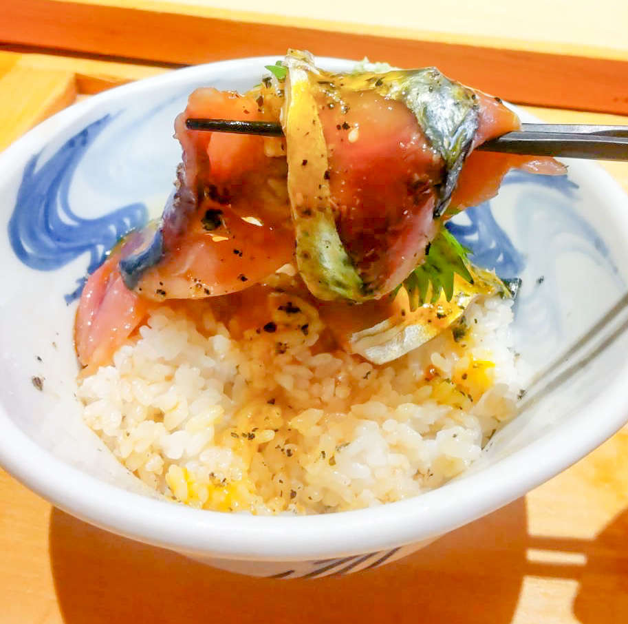 皆さん!!これが生さば丼です!!思わず箸上げ写真を撮ってしまいました。小鉢のごまをお好みですり潰してかけてお召し上がりいただけます。ぷるぷる食感のさばにごまの風味ととろとろの卵が合わさって悶絶すること間違いなしの一品です。量も程よく、追加でサイドメニューもいけちゃいそうです。