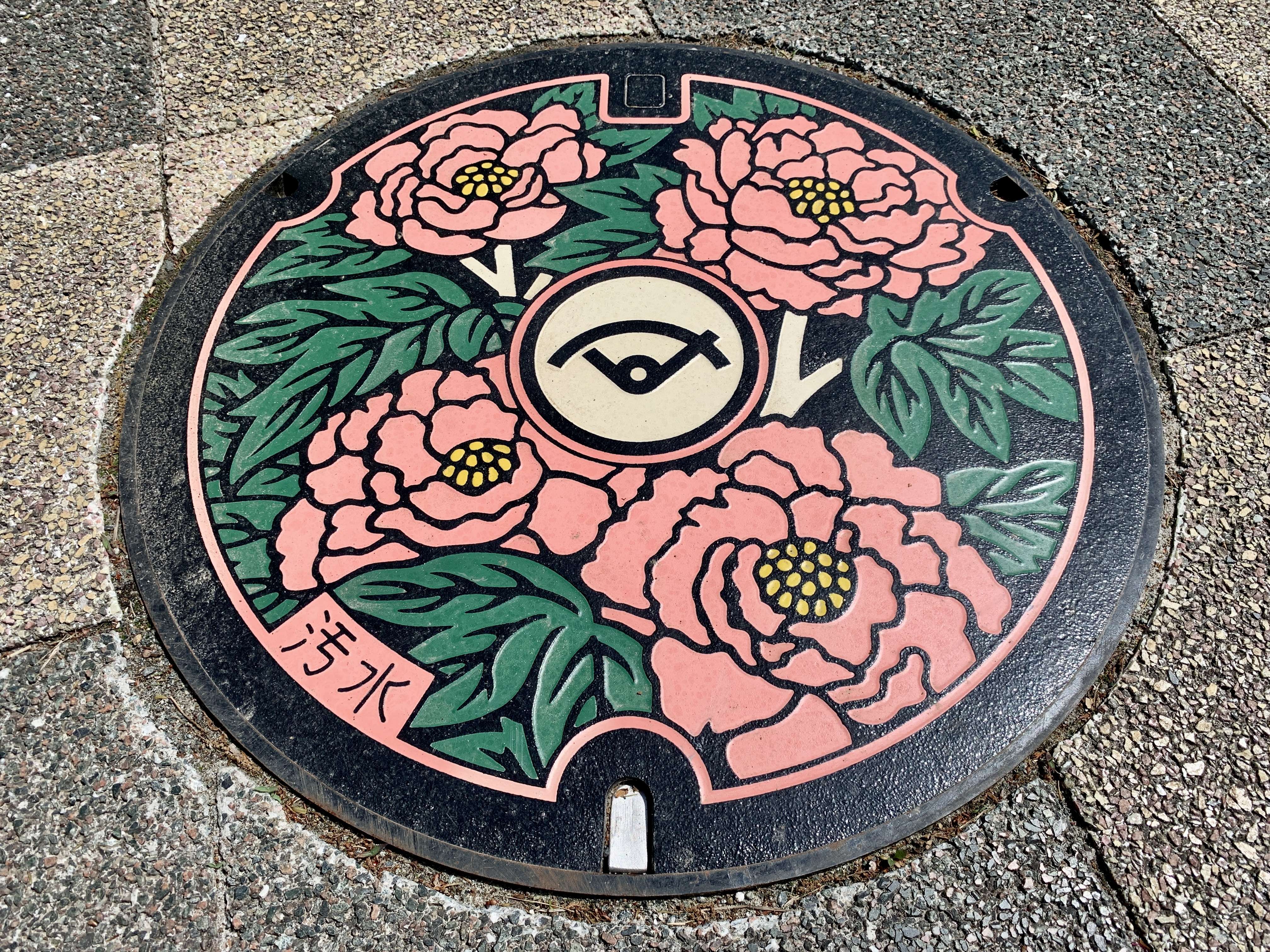 友好交流都市(須賀川市・大仙市)のデザインマンホール蓋は中心に「市章」、その周りに市の花「牡丹」が彩られたデザインになっています。