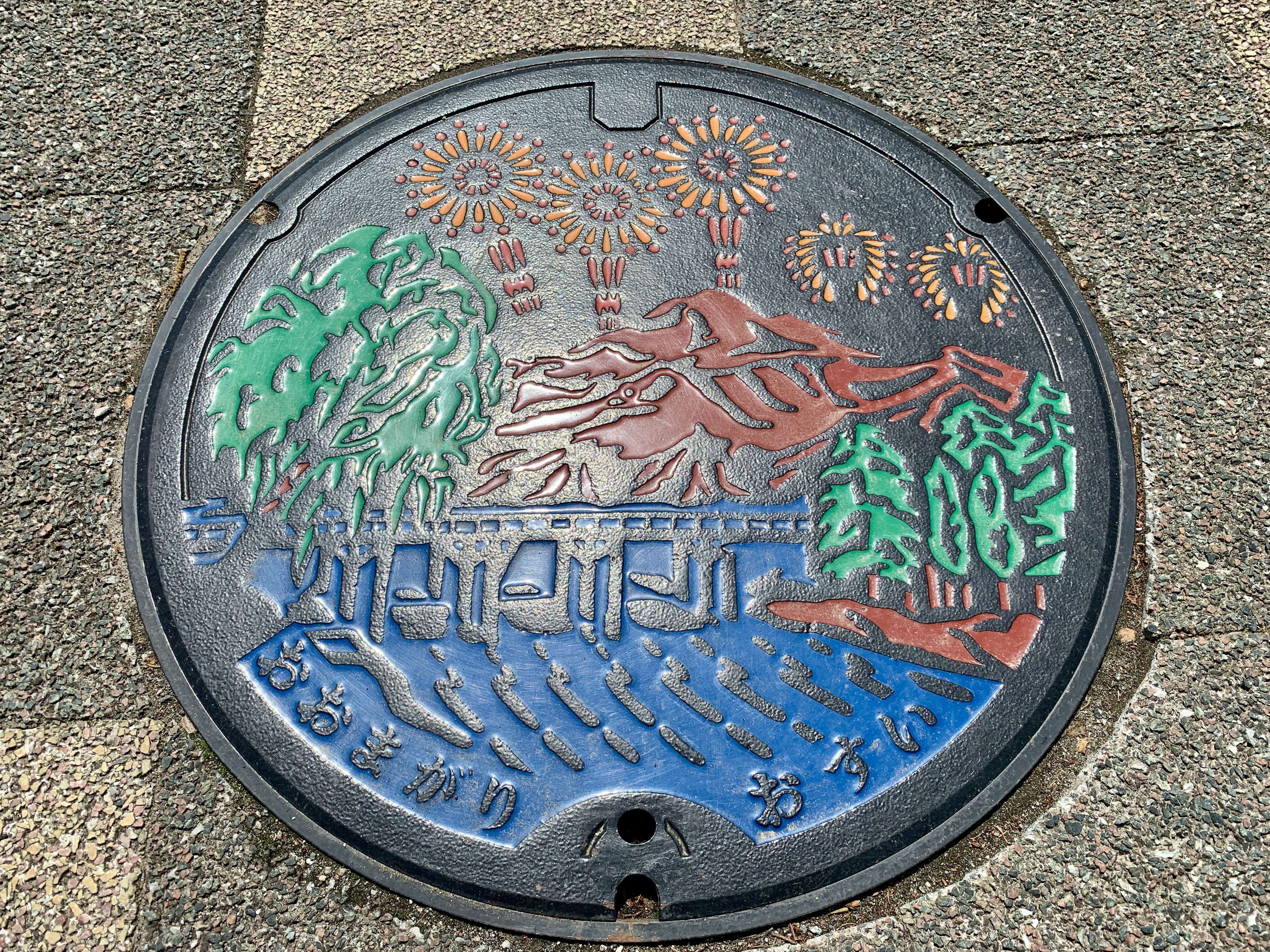 大仙市のマンホール蓋は、柳を伴う丸子川にかかる丸子橋から望む西山に、「大曲の花火」が彩りを添えたデザインになっています。