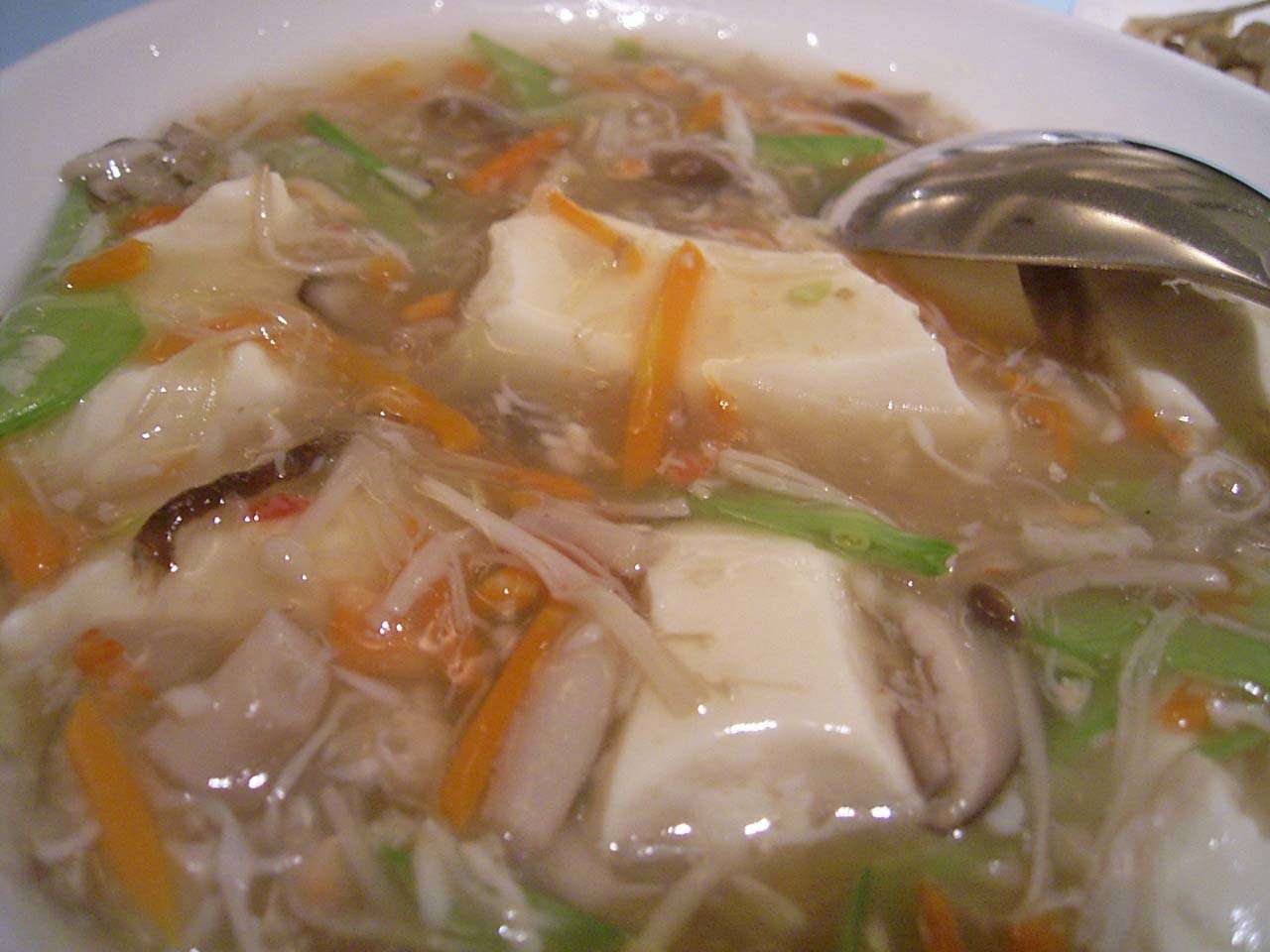 一丁の豆腐に人参、さやえんどう、蟹肉、キノコの餡掛けです。