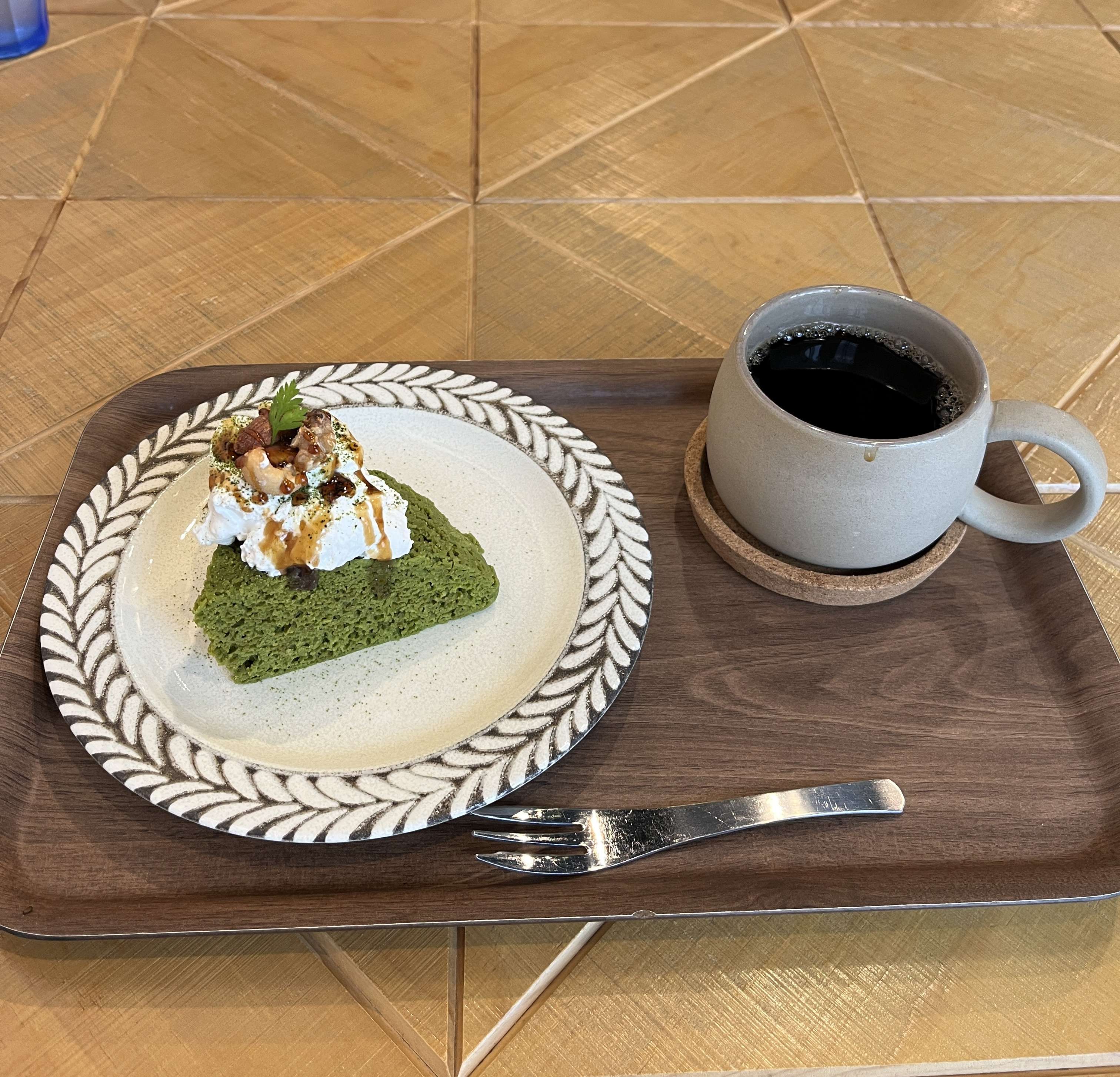 大きめのカップにたっぷり入ったコーヒーとグルテンフリーの抹茶ケーキのセットは750円(税別)と、リーズナブル。