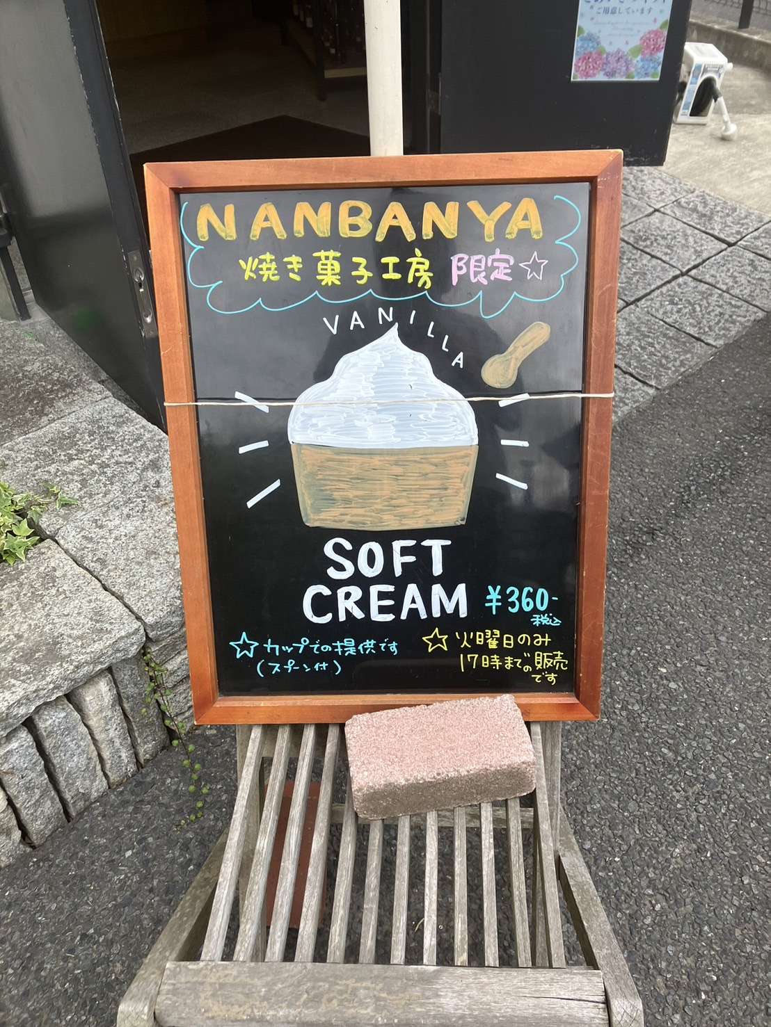 工場見学をした後は、私たちは焼き菓子工房でソフトクリームを購入してベンチで食べました。