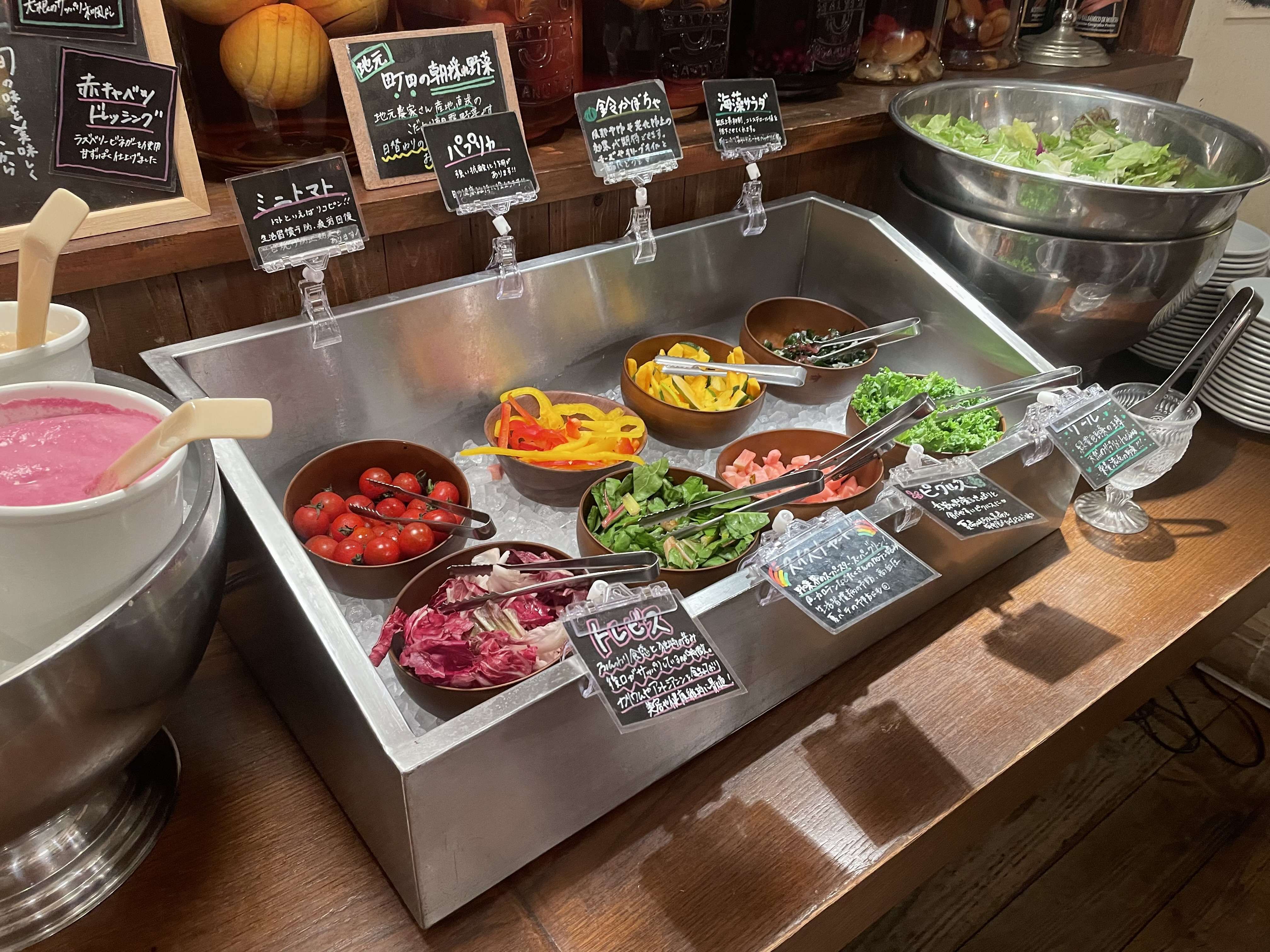 サラダバーは種類も豊富で、健康をかみした贅沢な野菜が並びます。
