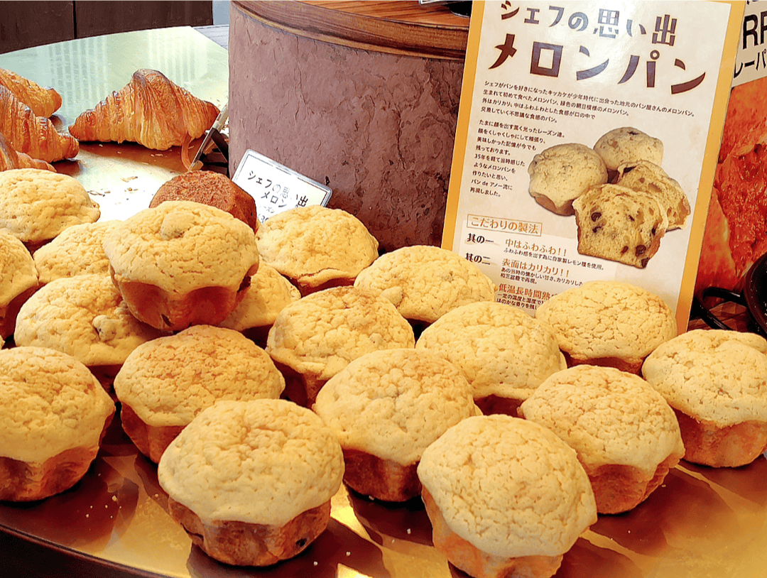 珍しいフォルムのメロンパン。レーズン入りというのが懐かしさを感じさせます。一定の温度と湿度で18時間ゆっくり発酵させ、ほのかな香りを残しつつ熟成させて焼き上げた自慢の1品だそうです。