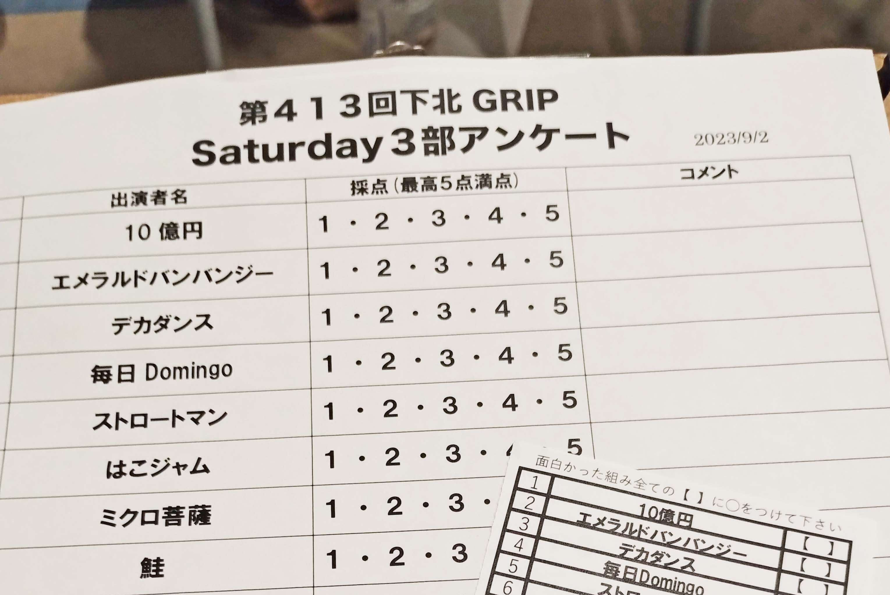 観客にはアンケート用紙が配られ、採点(最高5点満点)を記入する用紙と、面白かった3組に〇をつける用紙があります。