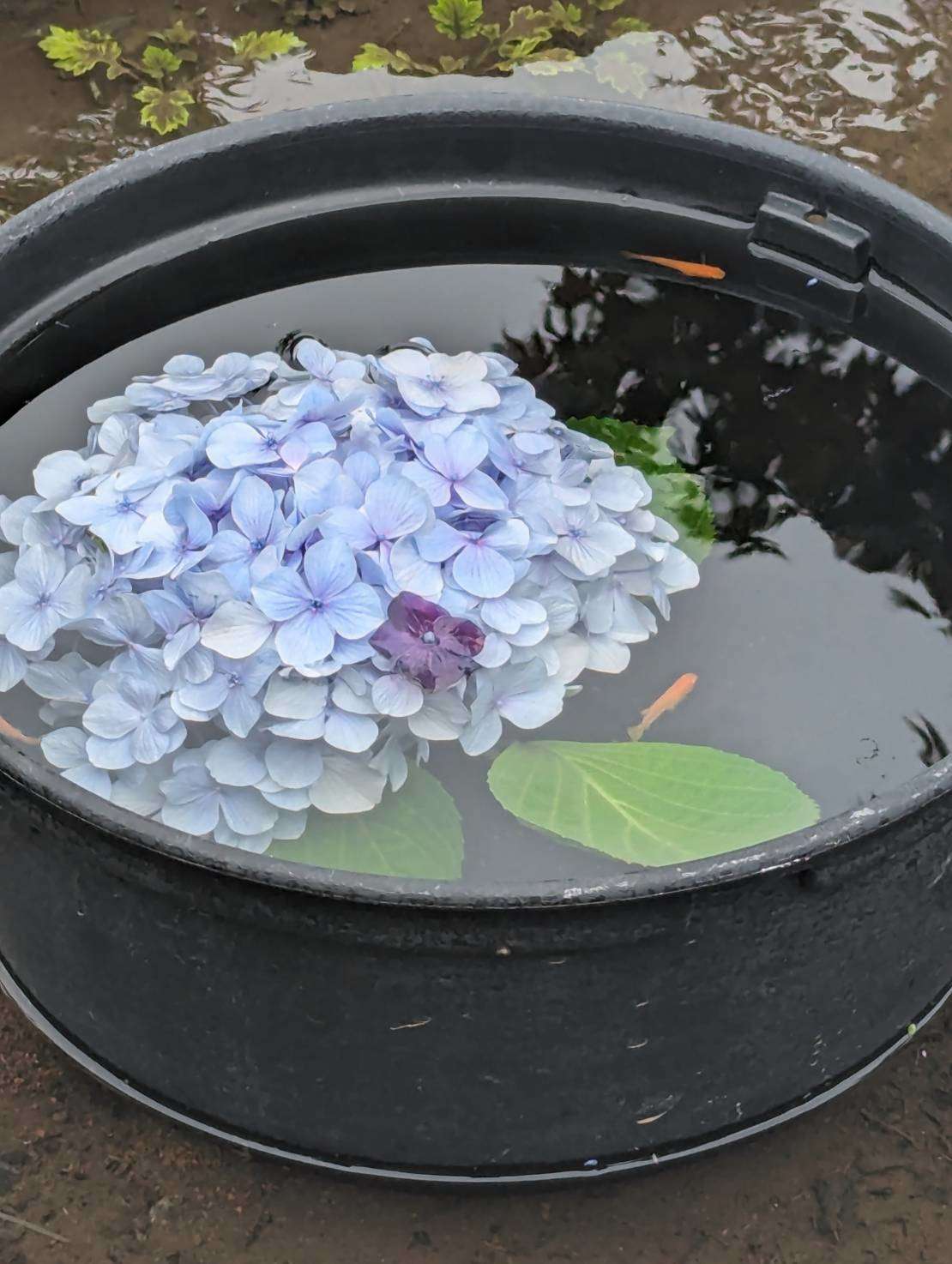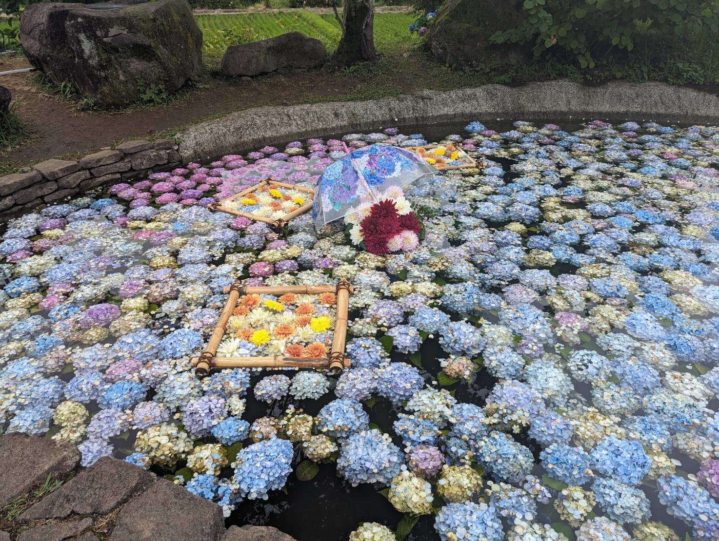 会場の横には色とりどりのあじさいが浮かんだ池がありました。