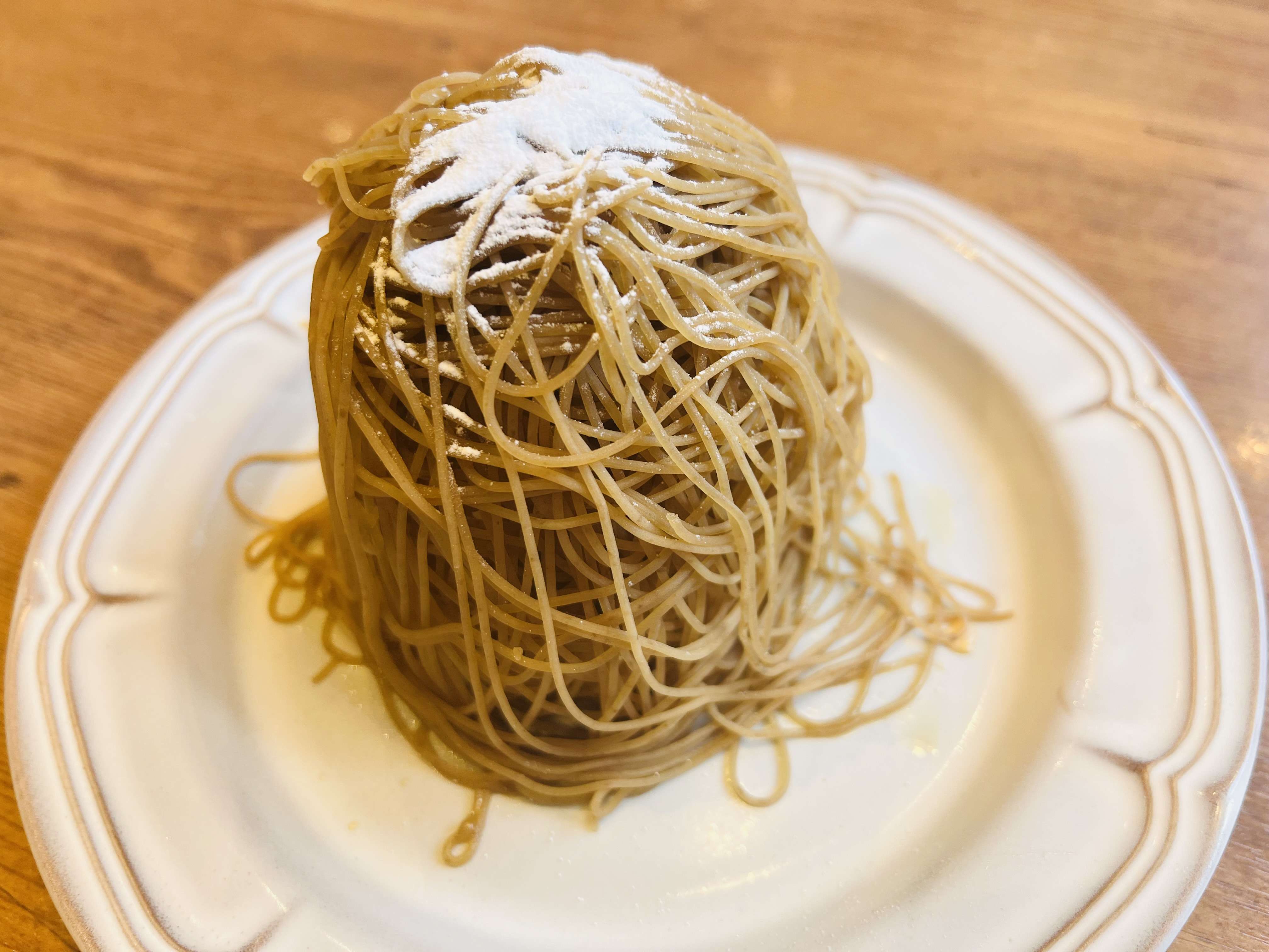 さらに、デザートも注文しました。オリーブの丘と言えば!というくらい定番人気デザート「しぼりたてオリーブの丘モンブラン」¥490。なんとモンブランの中には、アイスとプリンが入っています!気分が上がるデザートですよ。