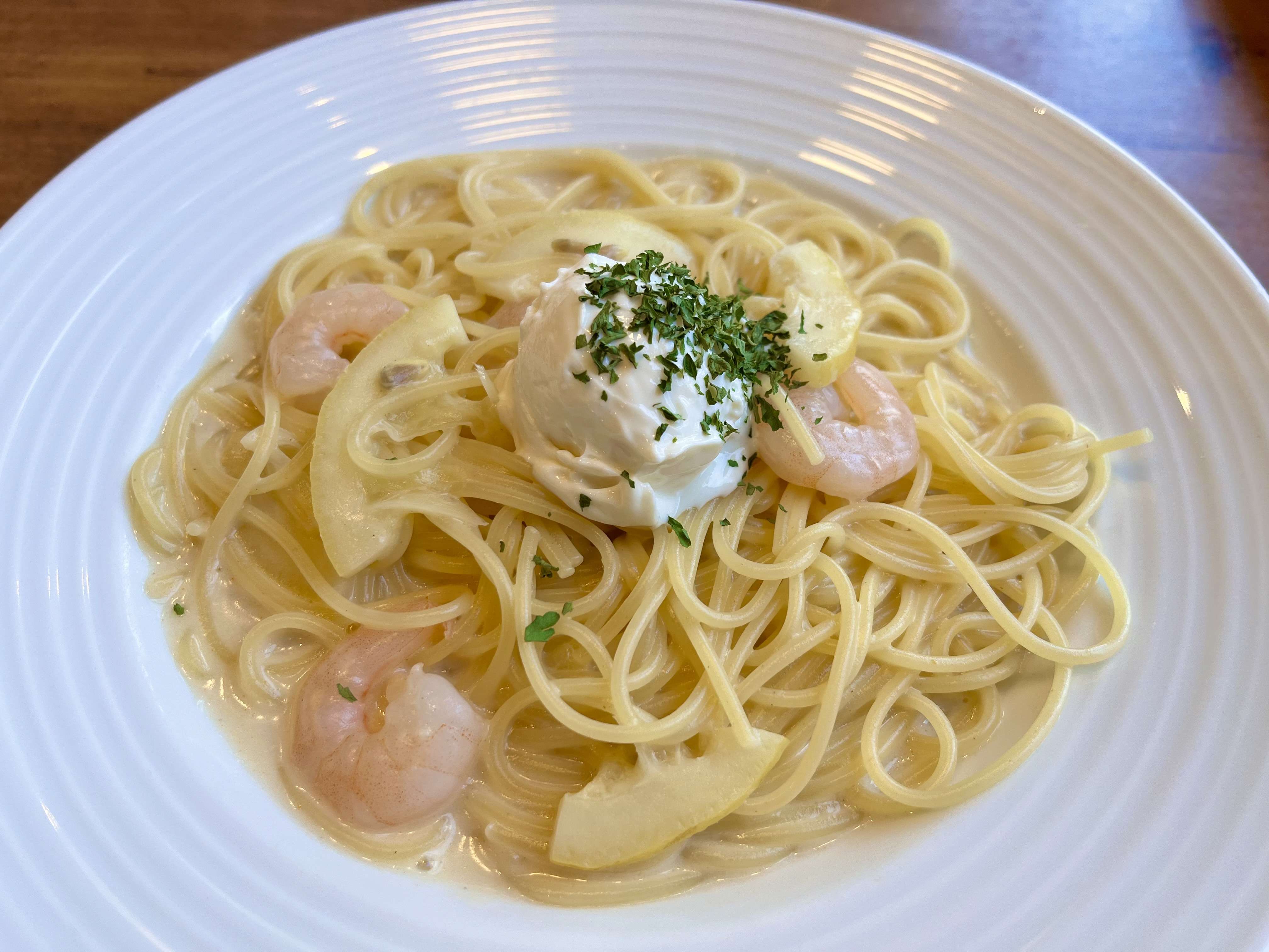 この日はランチ限定ではないメニューを選びました。注文したのは単品「イタリア産リコッタとえびのレモンクリームソース」¥590。ランチメニューほどではないですが、単品でも十分お手頃です!