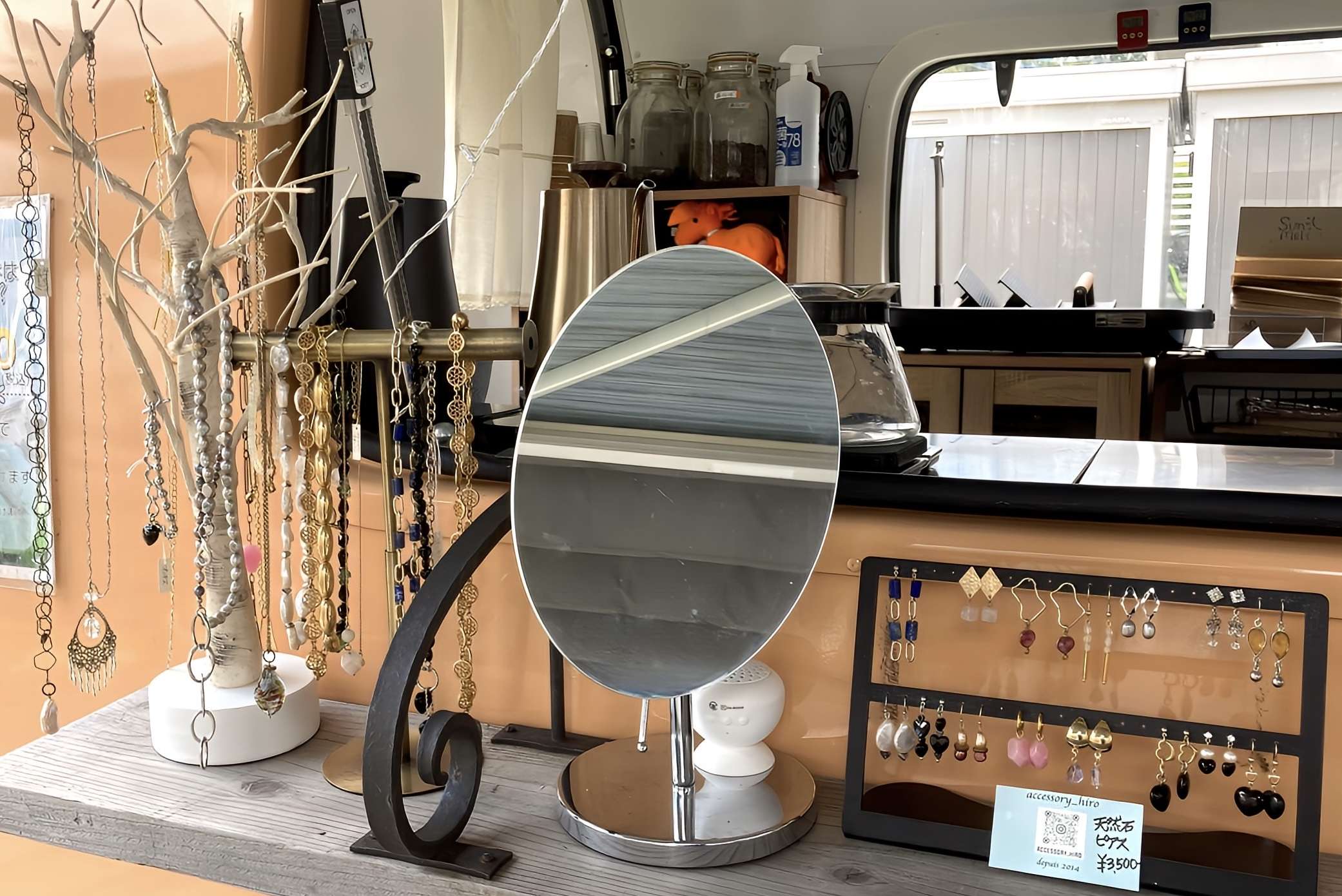 お店のテーブルやウッドデッキはすべてオーナーさんの手作り。店頭に並ぶアクセサリーは奥様の作とのこと。お二人の温かい雰囲気が表れたとっても素敵な数々です。
