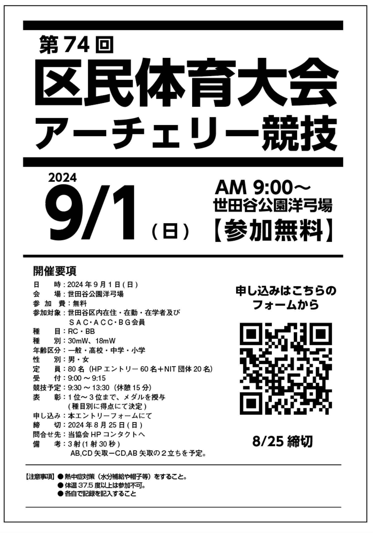 2024年9月1日(日)に、世田谷公園洋弓場(三宿)にて、第74回 区民体育大会「アーチェリー競技」が開催されます。参加希望者は、下記ご覧の上エントリーしてください。