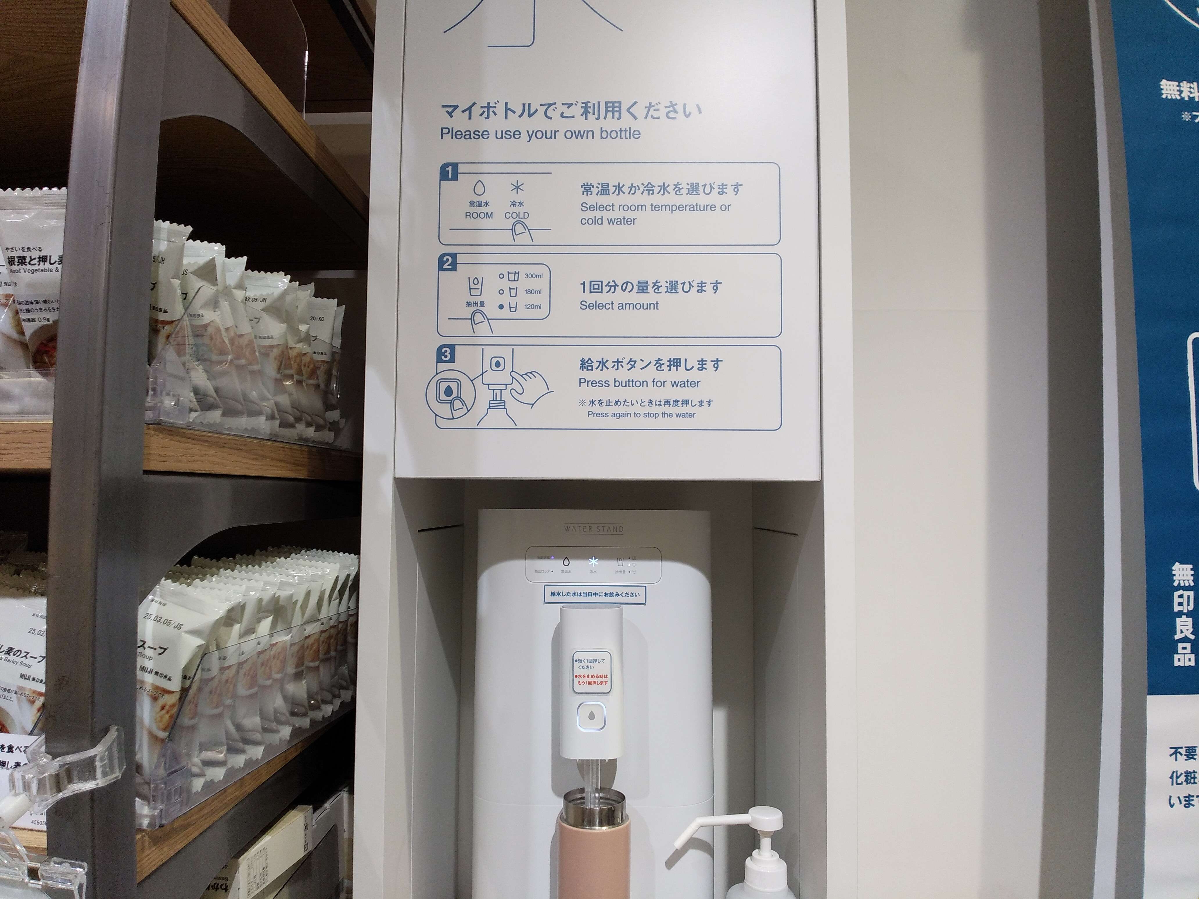 でもこの無印良品では、給水機が備えられていて、マイボトルをもっていけばいつでも無料で冷たいお水を補給できるんです。