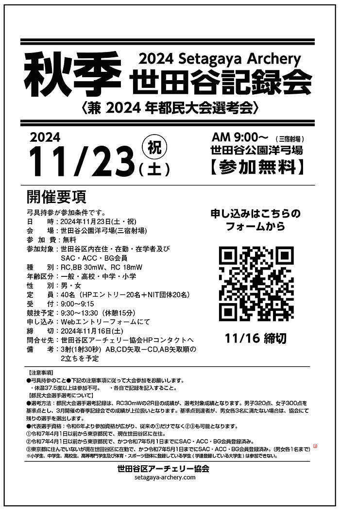 2024年11月23日(土・祝)に、世田谷公園洋弓場(三宿)にて、「2024年秋季世田谷記録会」(アーチェリー大会)が開催されます。参加希望者は、下記ご覧の上エントリーしてください。