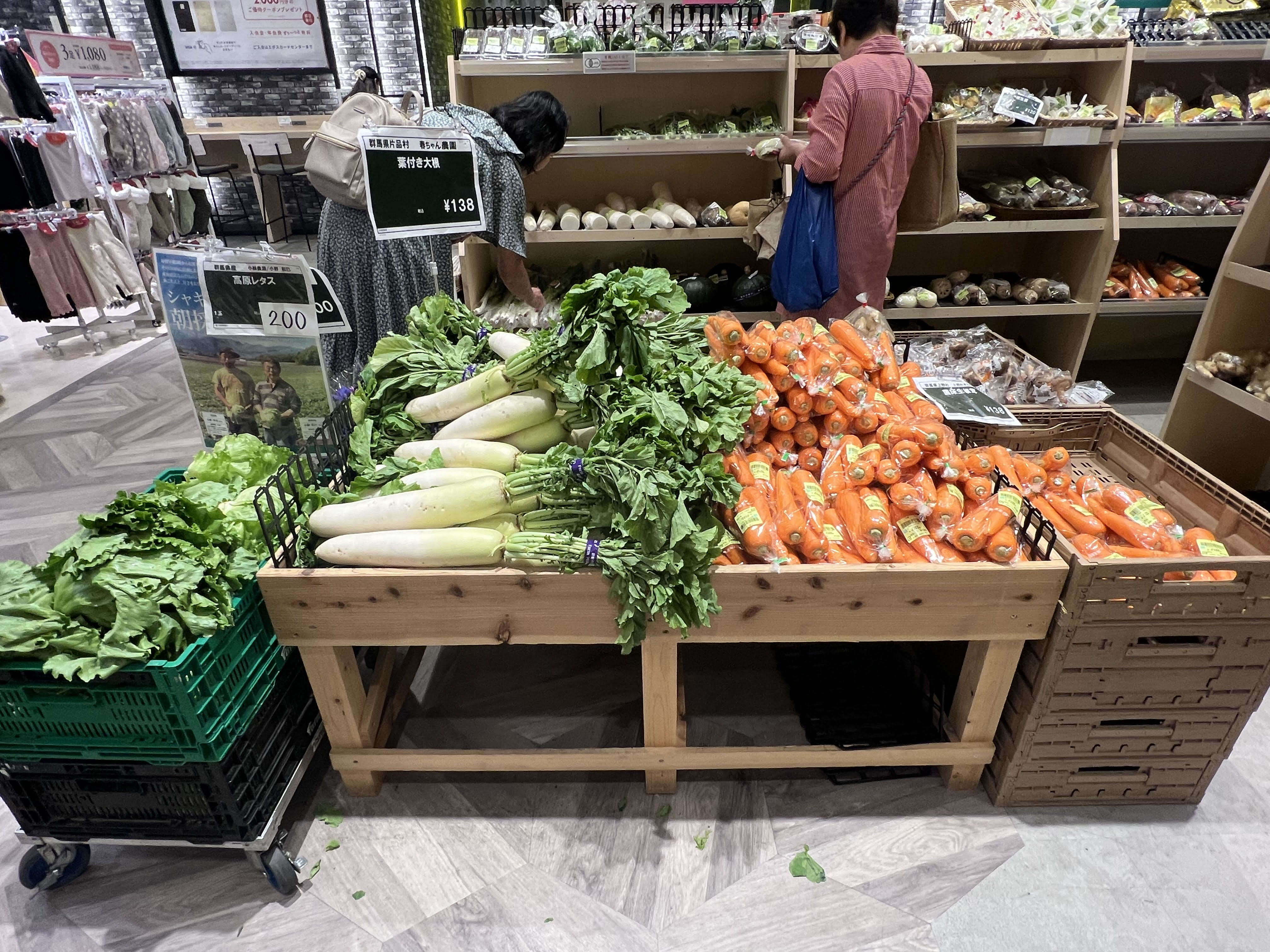 町田駅から歩いて3分の丸井町田店の2階に、「地産マルシェ」という八百屋があります。朝に収穫したばかりの野菜や果物が所狭しと並べられ、大人気です。隣には雑貨や軽食を売る店舗が連なり、ショッピングのついでに、とれたて野菜を購入できます。また、地方のお菓子や、ドリンクなどの品ぞろえも豊富で旅行気分を味わうこともできますよ。