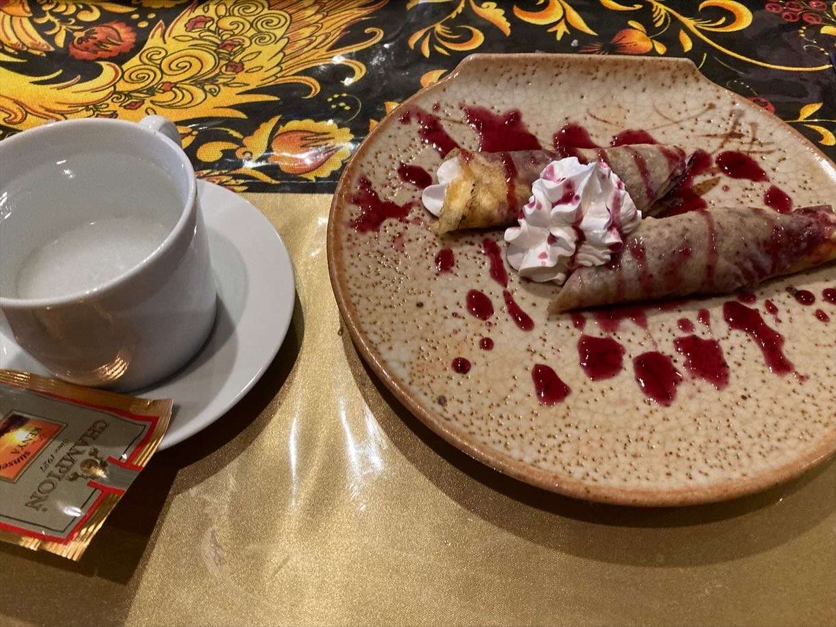 そしてもうおなかいっぱいのところにこれまたボリュームたっぷりの肉のチェブク、デザート、紅茶です。